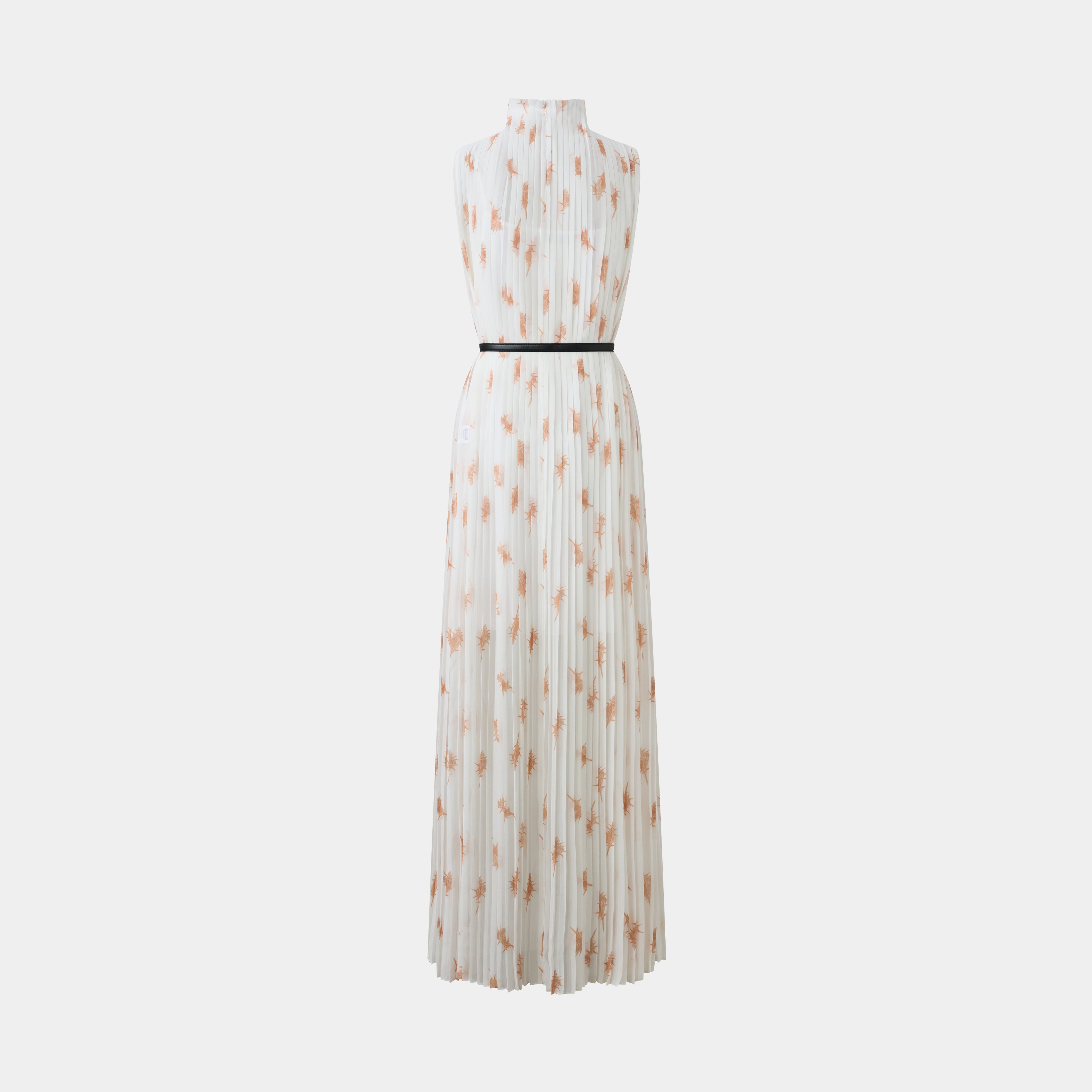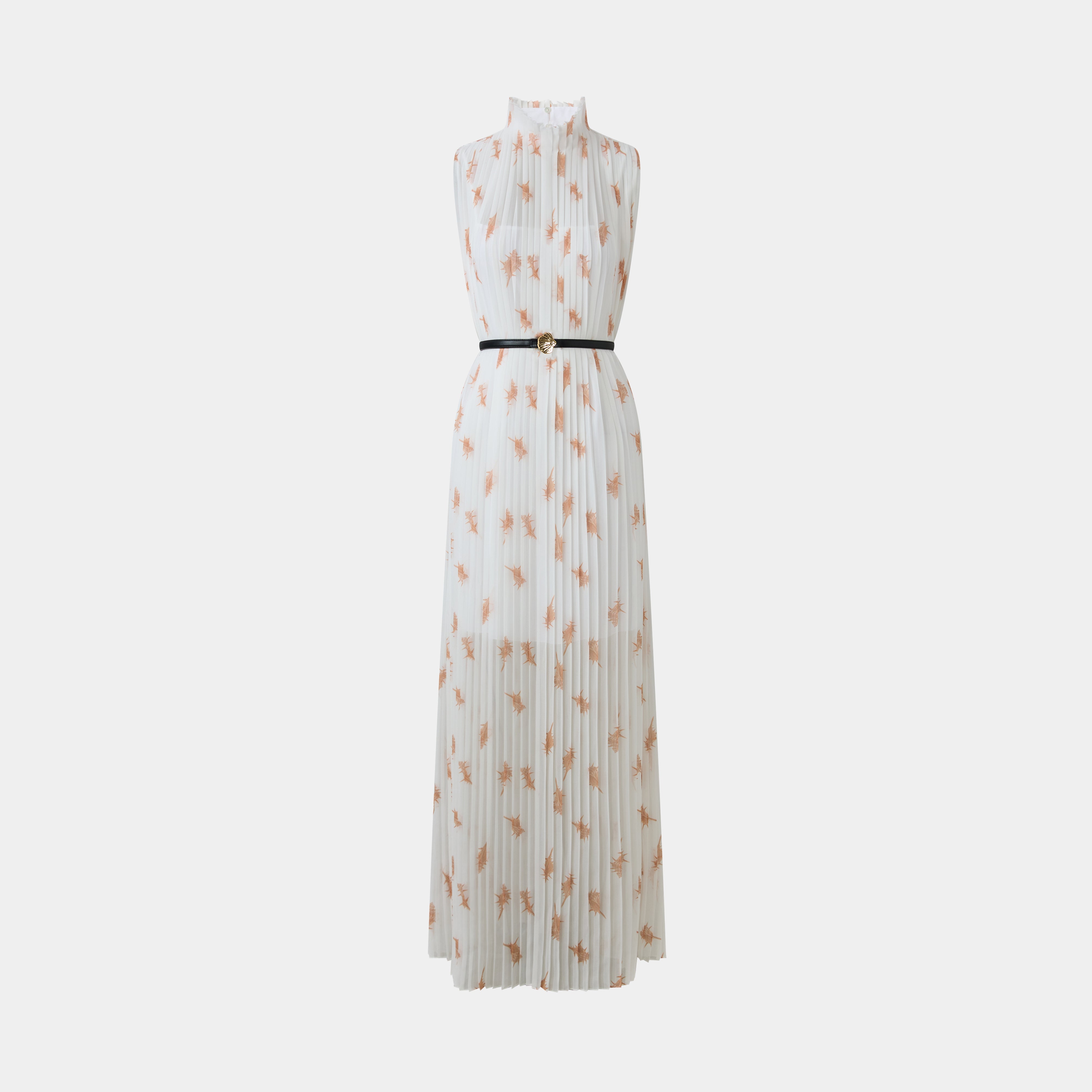 Sleeveless, high-neck pleated maxi dress featuring a scattered natural-inspired print. A slender belt with a shell buckle defines the waist for an elegant silhouette.