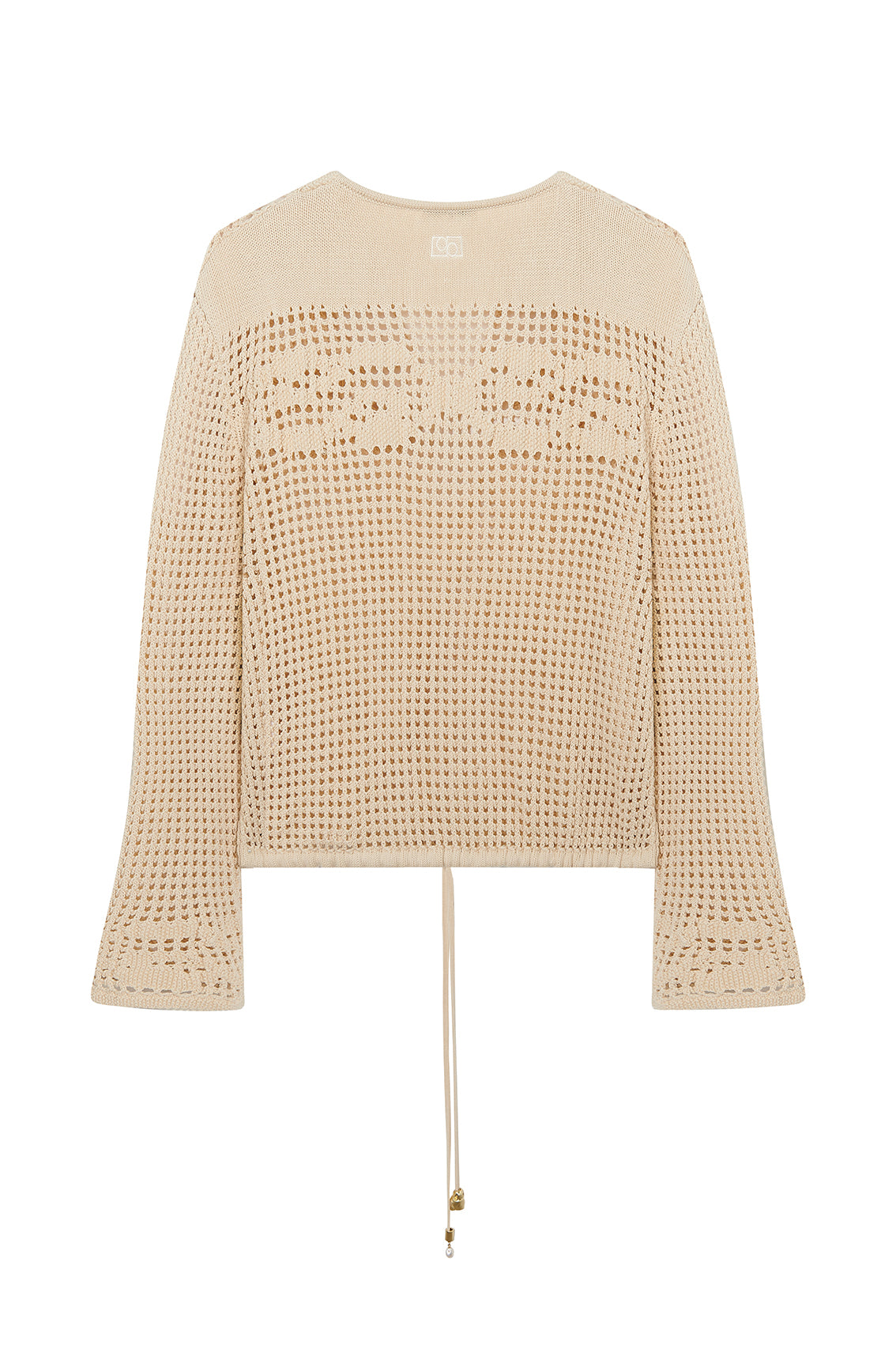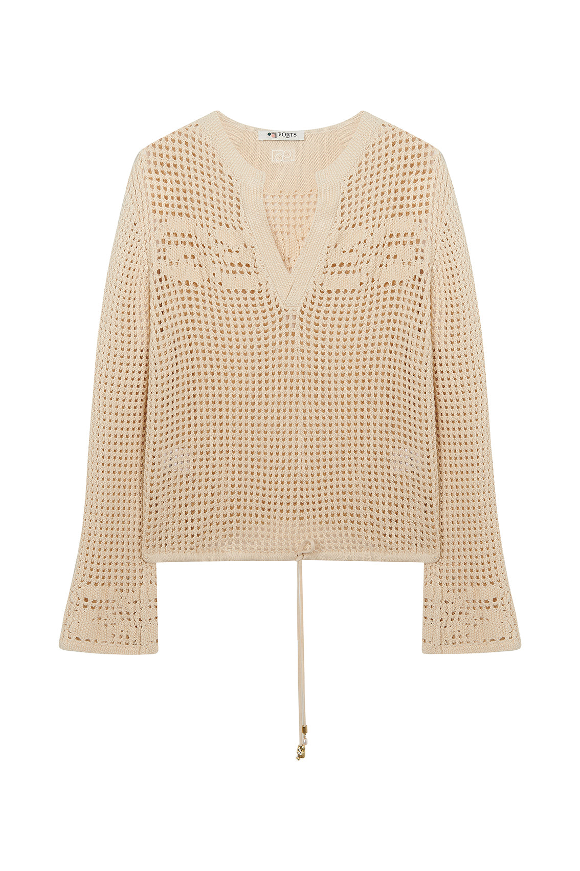 This long-sleeve top features an intricate open-knit crochet pattern. It has a V-neckline with a ribbed collar and a drawstring hem with delicate metal accents for adjustable styling.