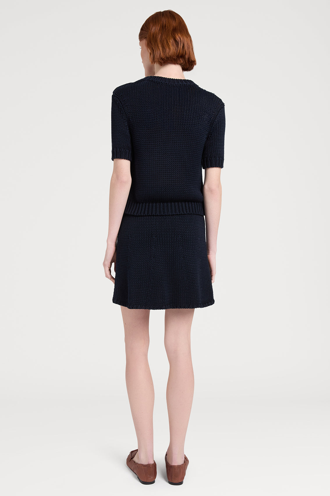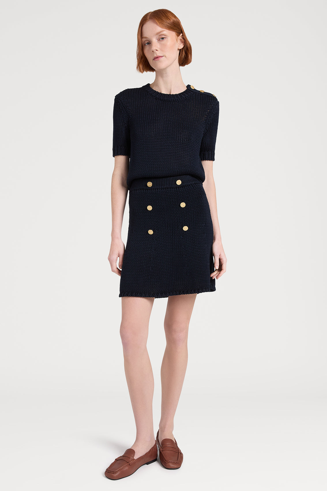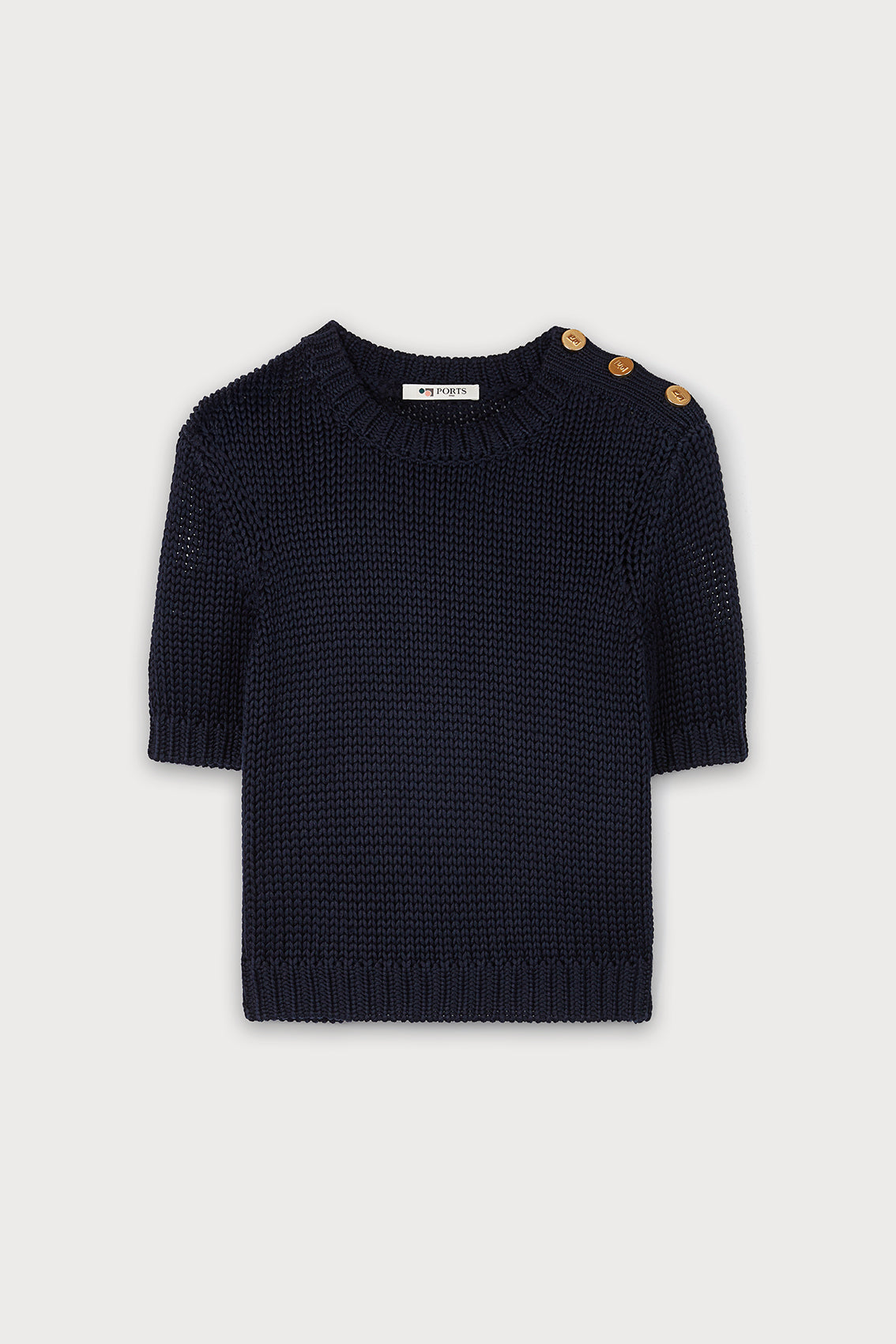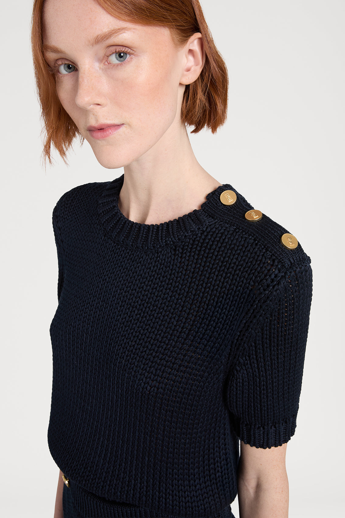 Navy knitted sweater with short sleeves and stylish shoulder button detail. Lightweight and breathable, perfect for vibrant summer days or casual layering.