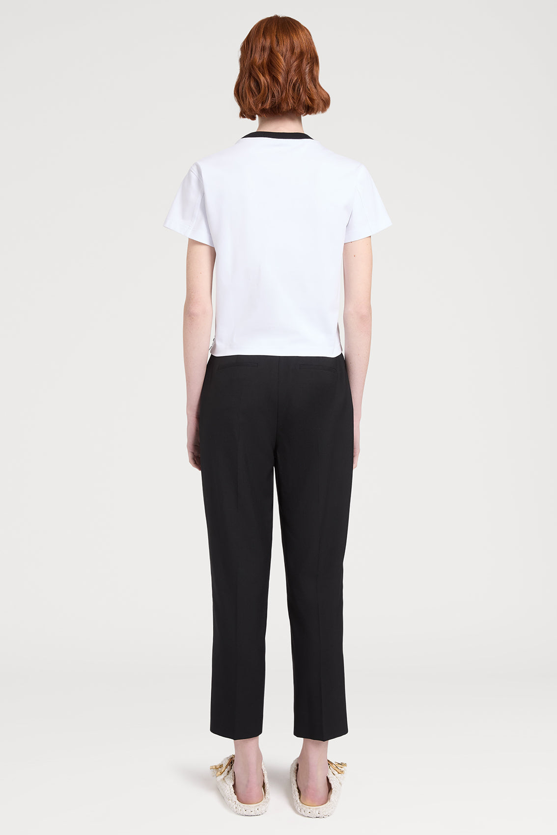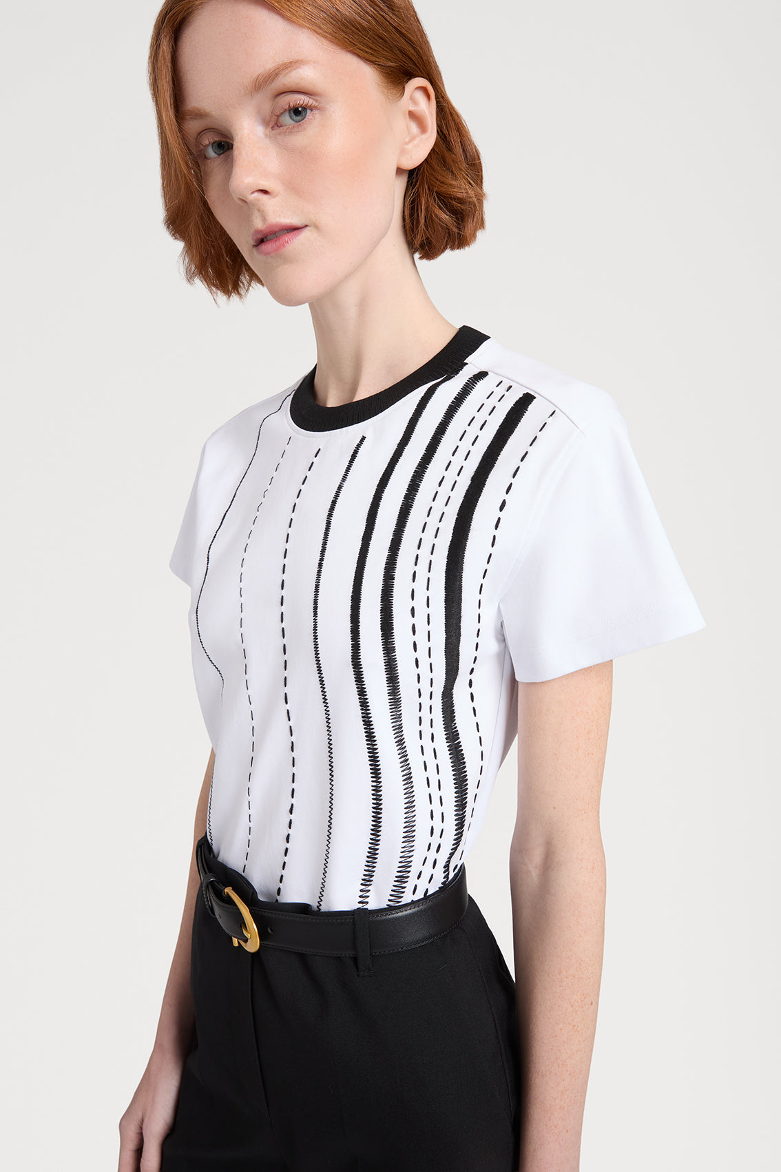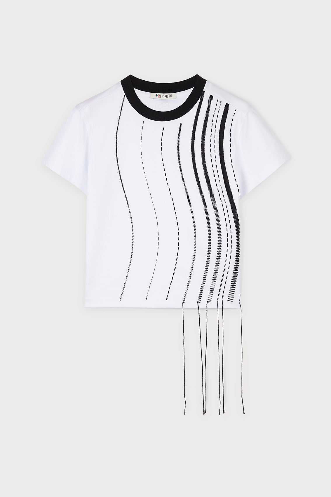 This white short-sleeve crop t-shirt with black crewneck, asymmetrical vertical wavy black lines and stitched stripes, extended loose threads on right side, minimalist modern graphic style.