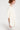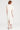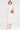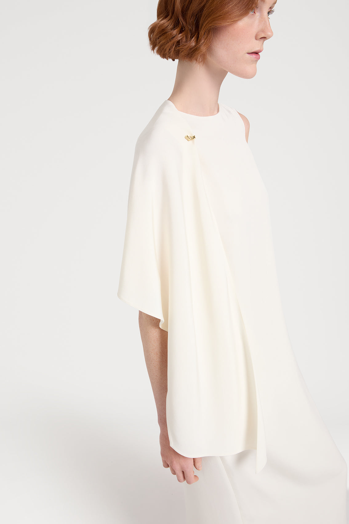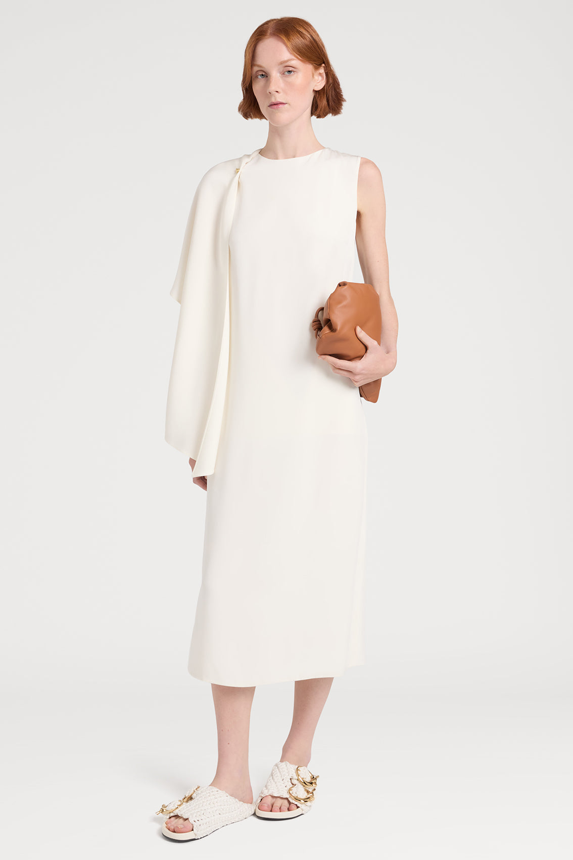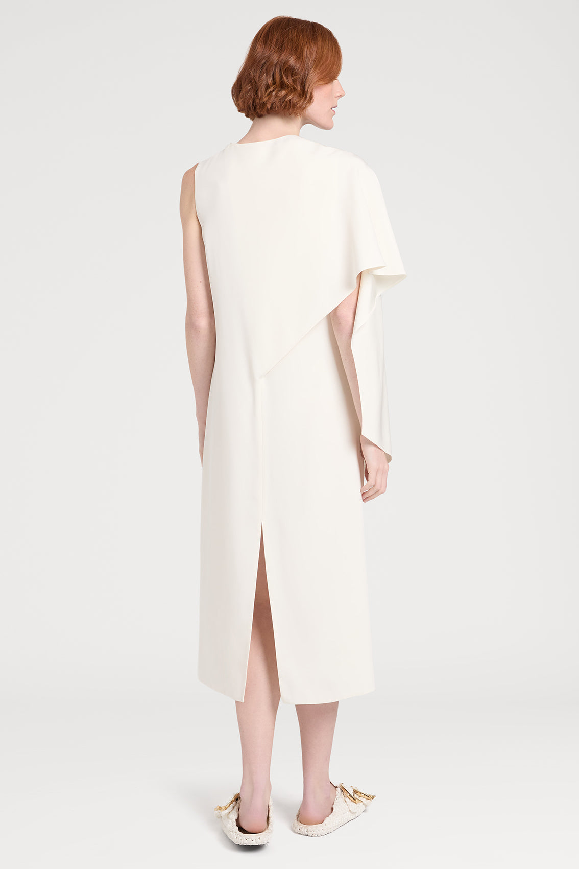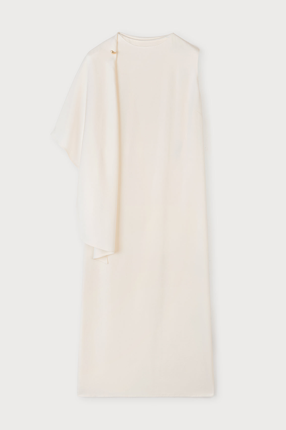 Ivory white shift dress with a unique draped shoulder, fastened by a small gold accent. Features a clean round neck and a straight, minimalist silhouette for modern appeal.