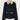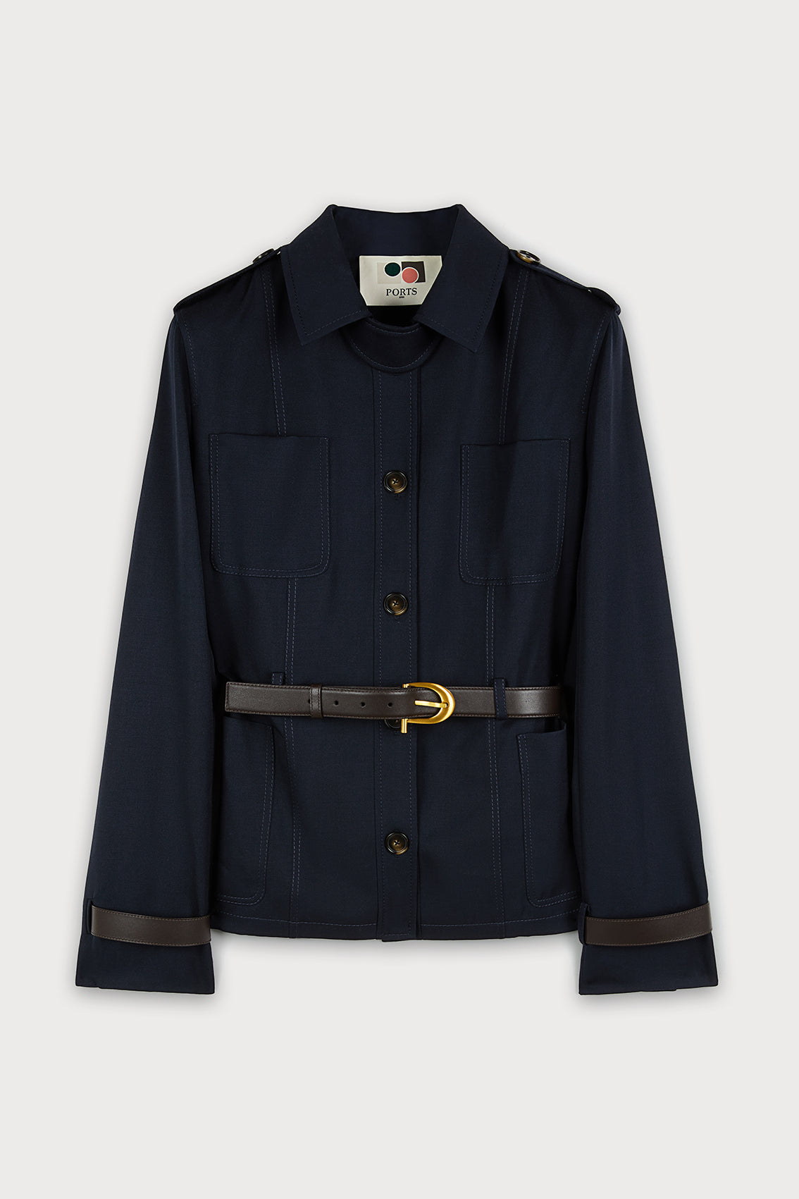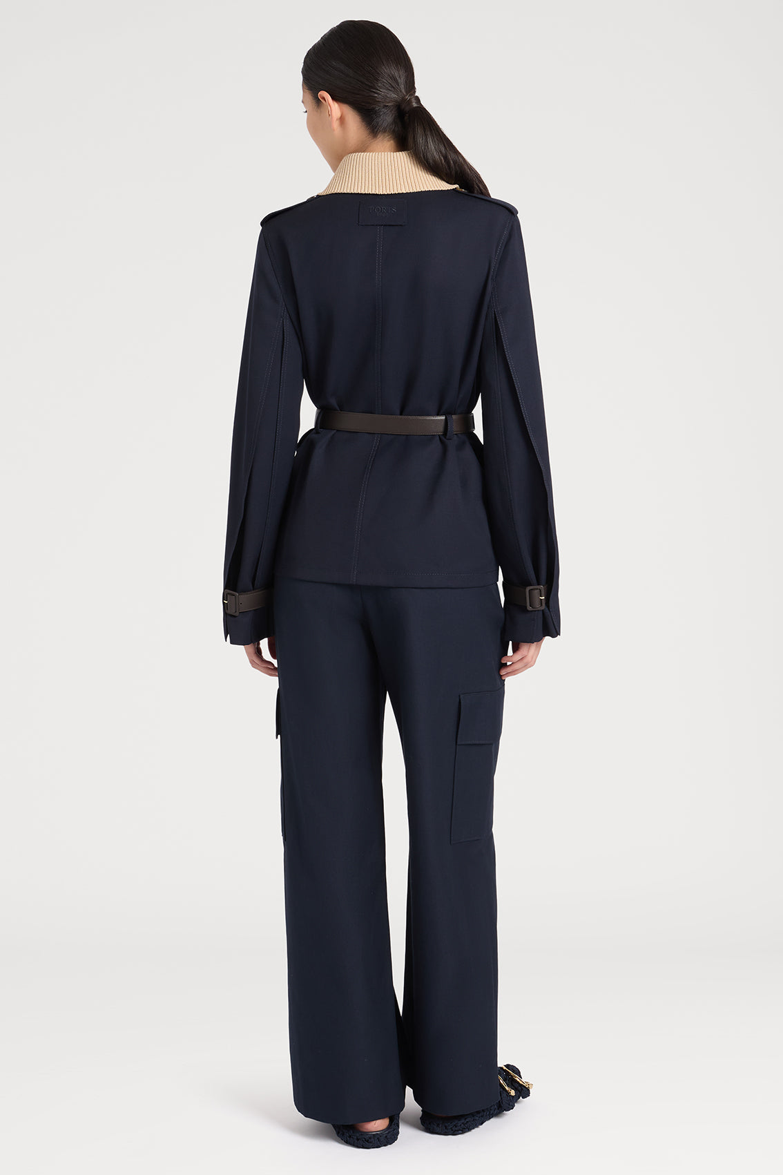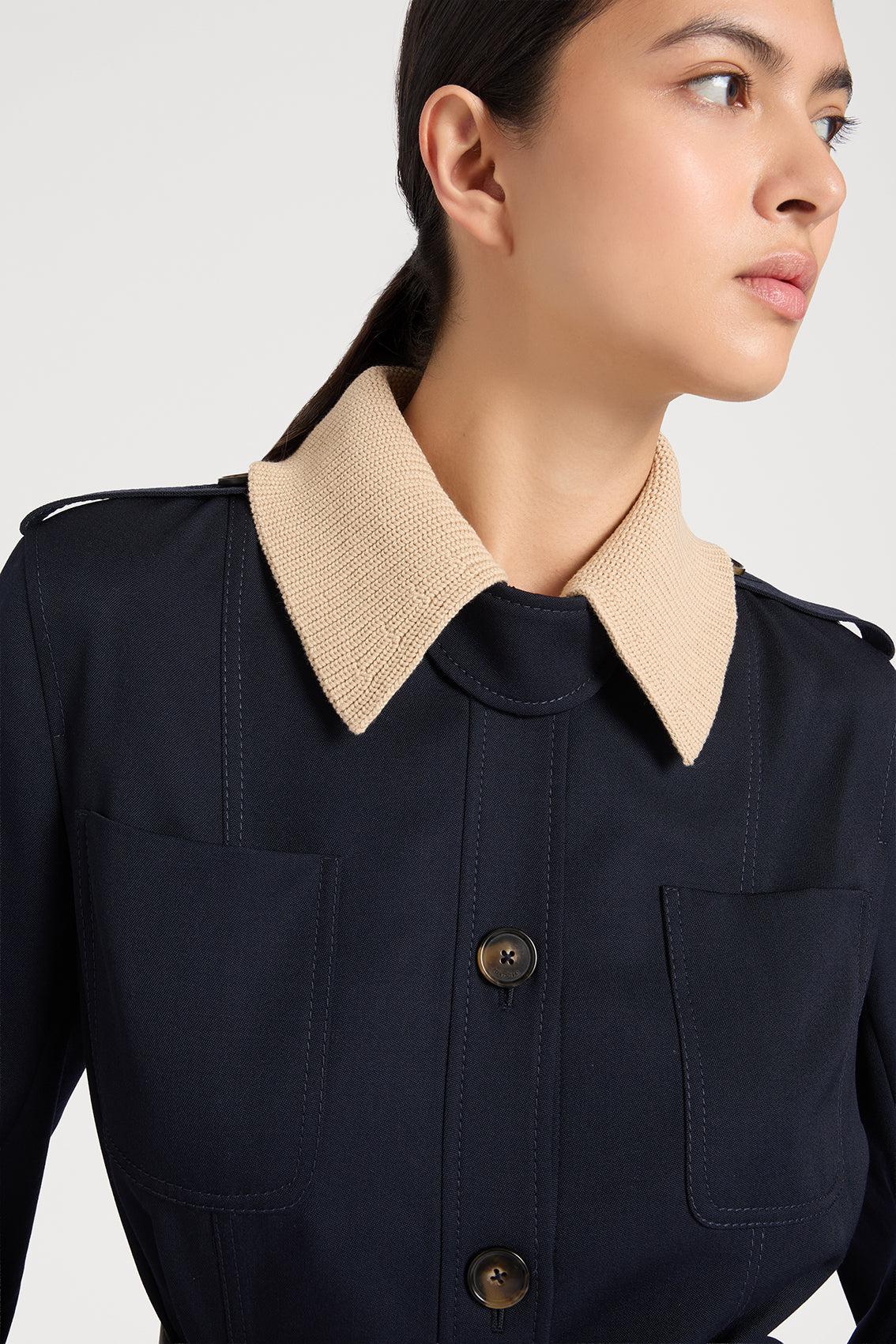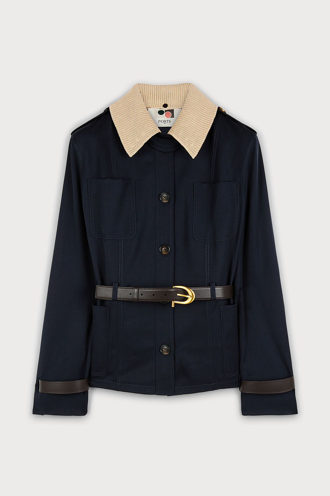 Navy jacket featuring a contrasting beige ribbed collar, a stylish dark brown belt with a gold buckle, and button-front closure. Its structured yet elegant design includes chest pockets and cuff details.