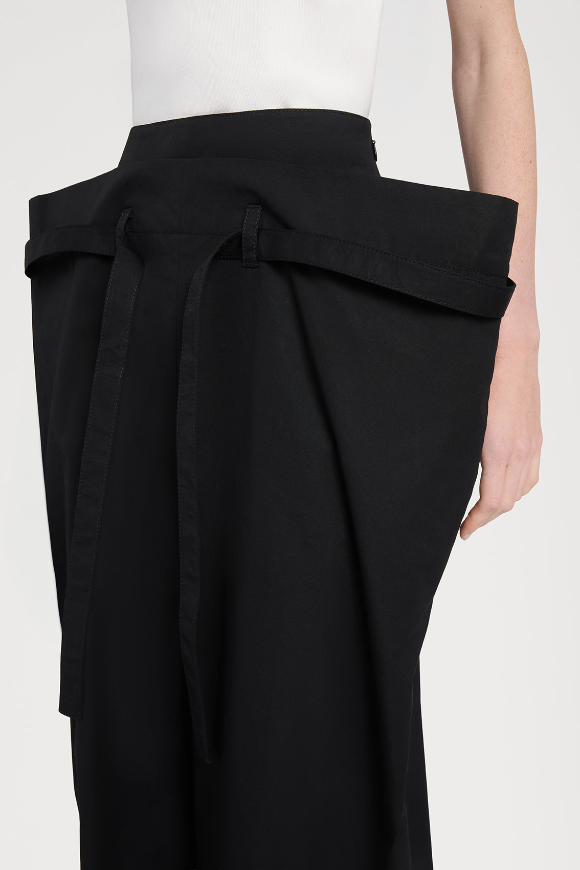 These chic black trousers feature a high, cinched paperbag waist with a tie belt. Their relaxed, wide-leg design and cropped length offer a modern and comfortable fit.