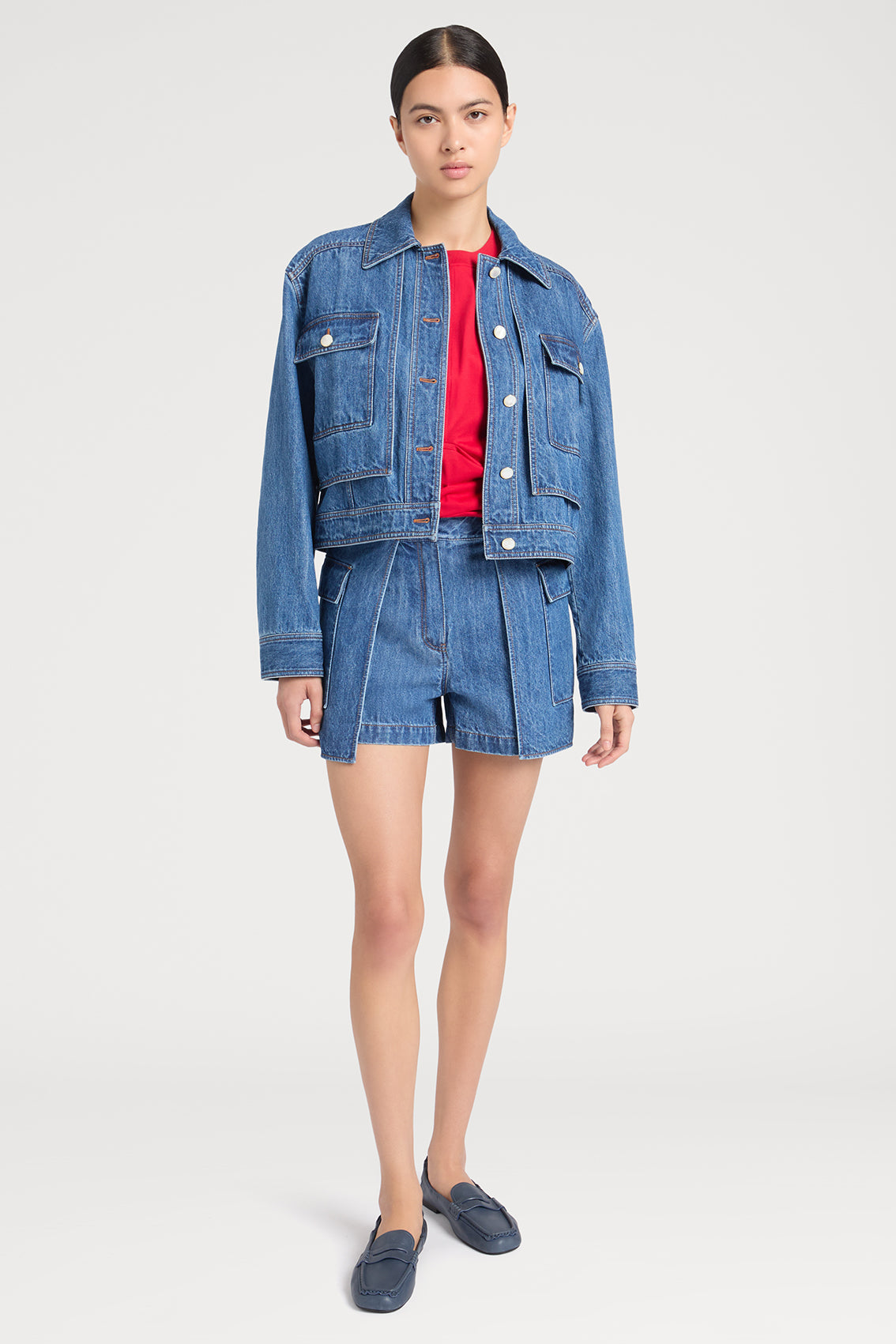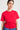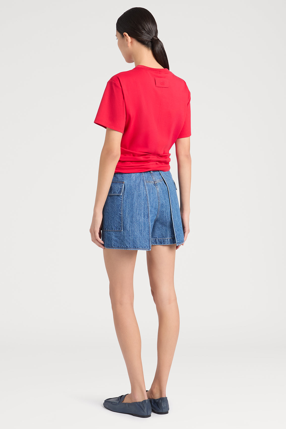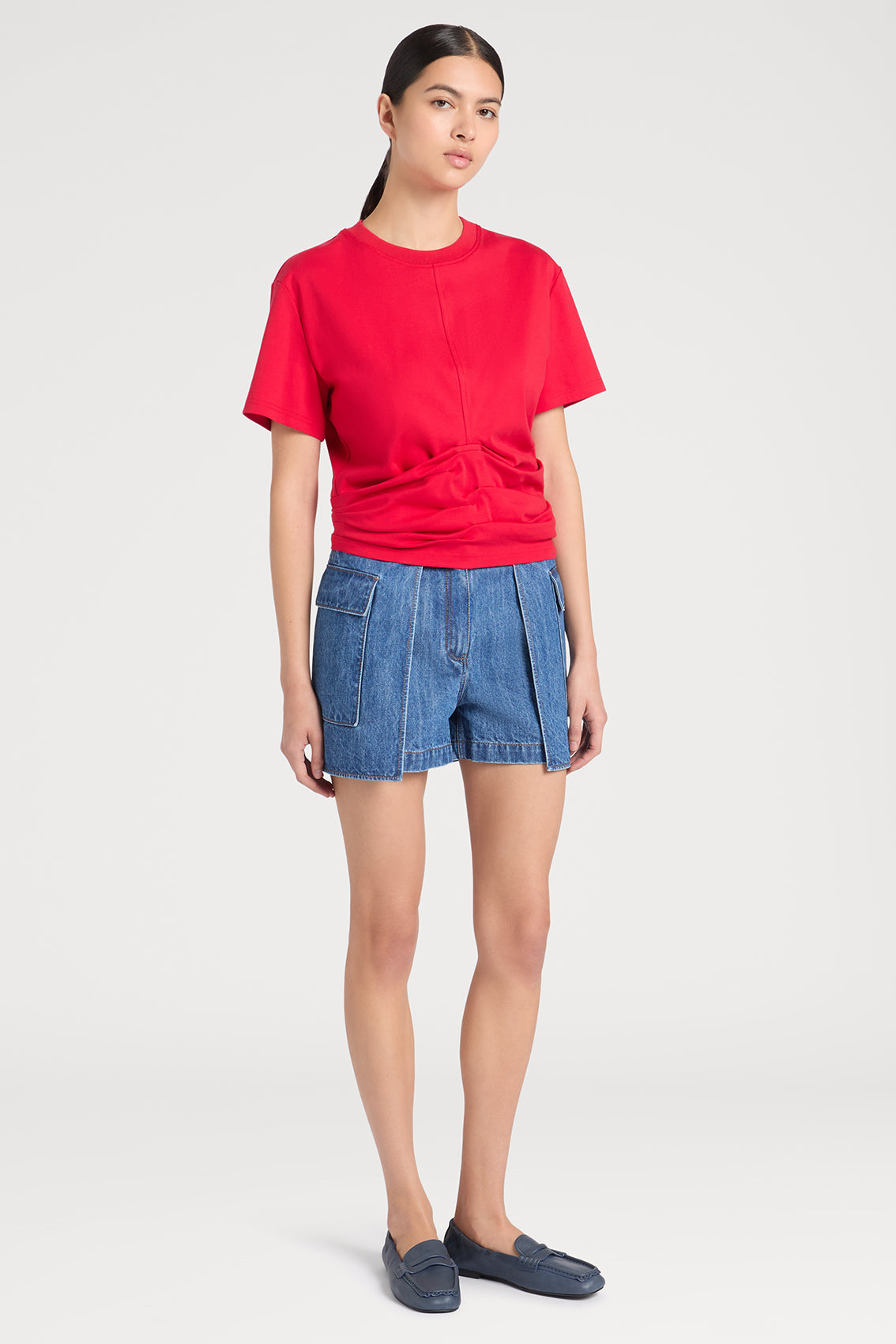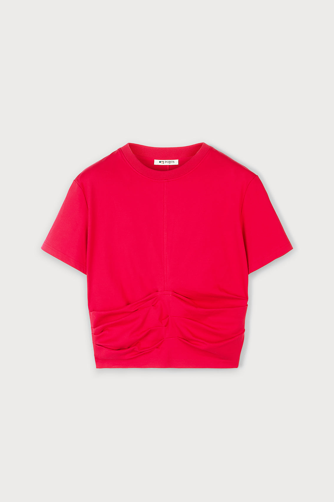 Vibrant red cropped short-sleeve top featuring a classic crew neck and stylish front ruching detail, creating a flattering and modern silhouette.