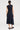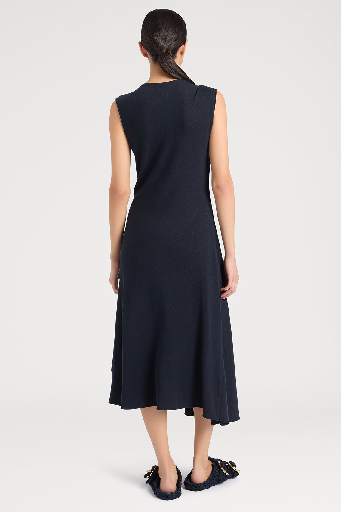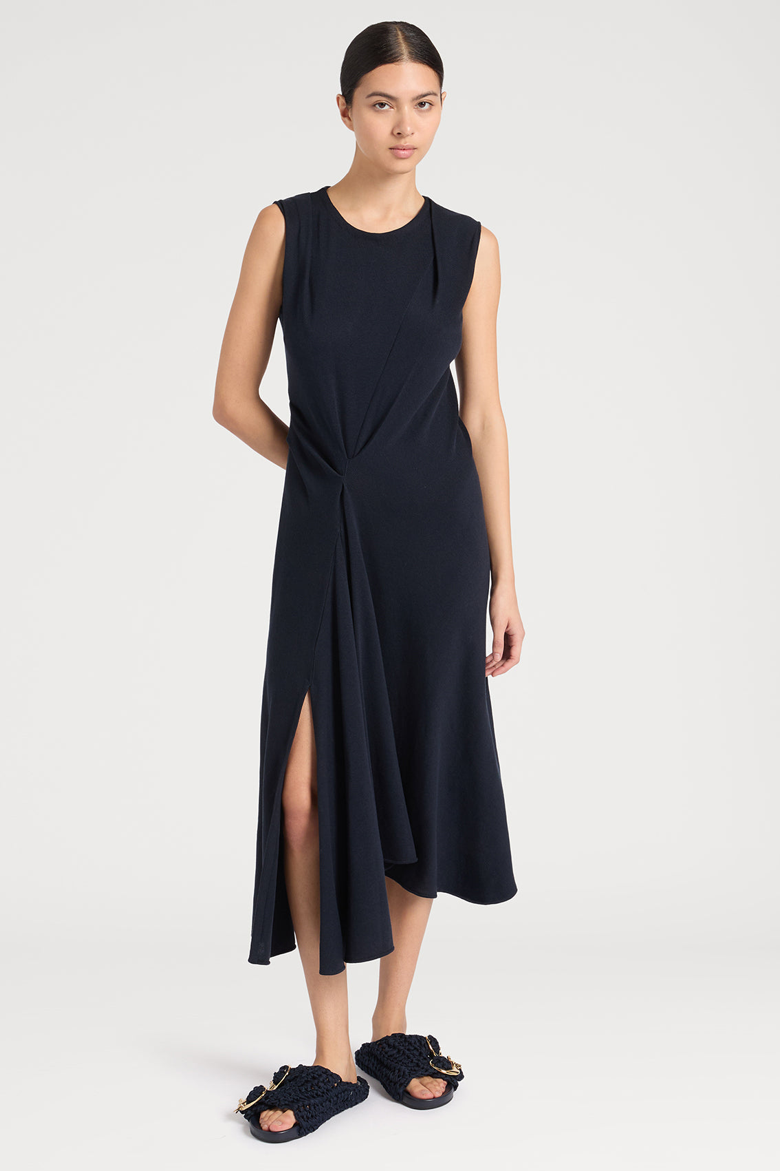 Elegant sleeveless navy blue dress featuring a sophisticated twist-knot waist, creating fluid draped pleats and a flowing, asymmetrical hemline for a chic silhouette.