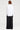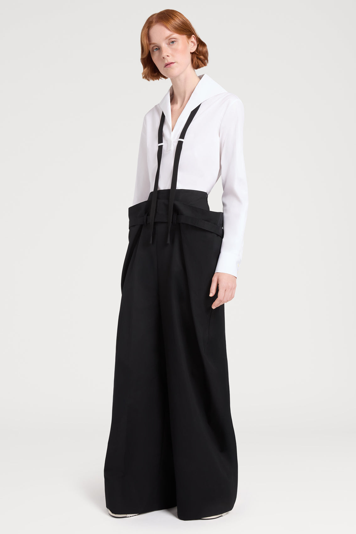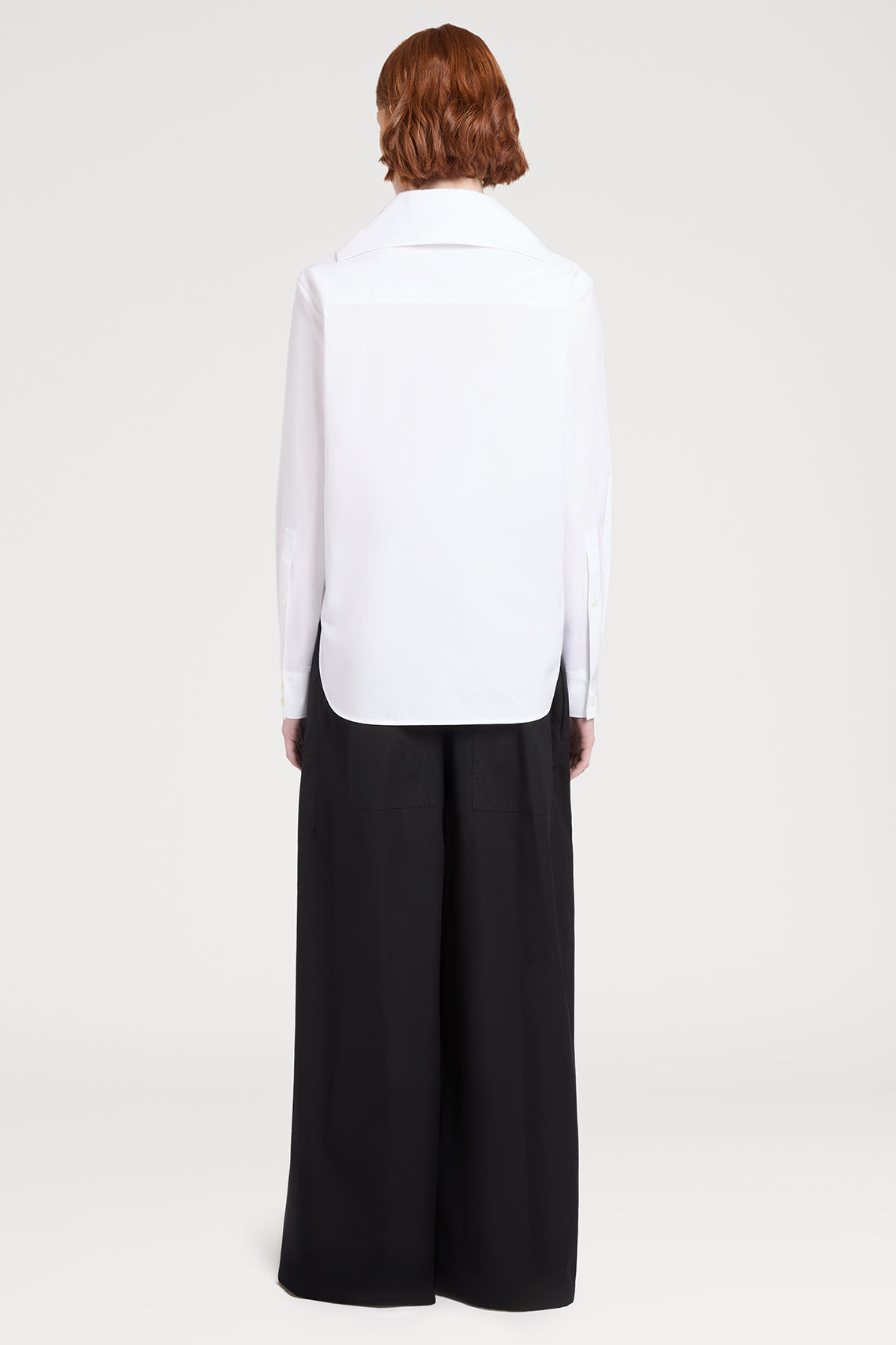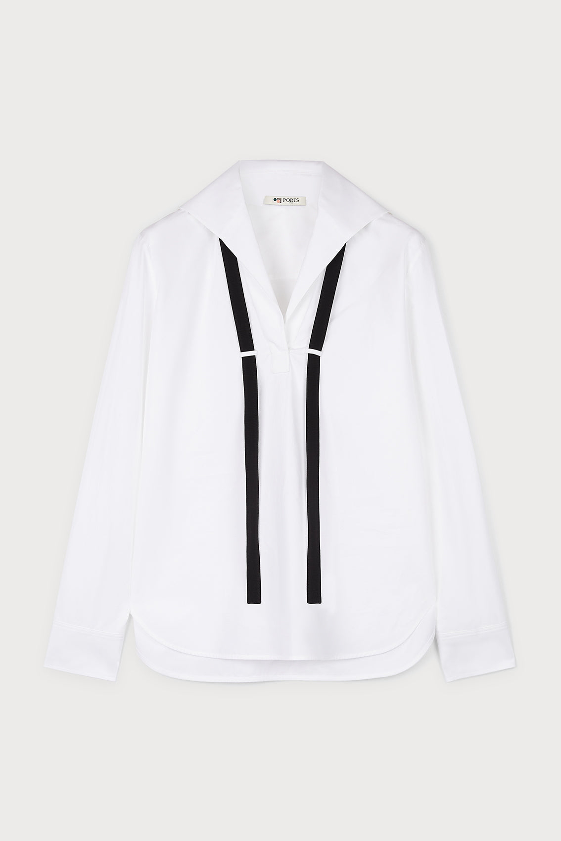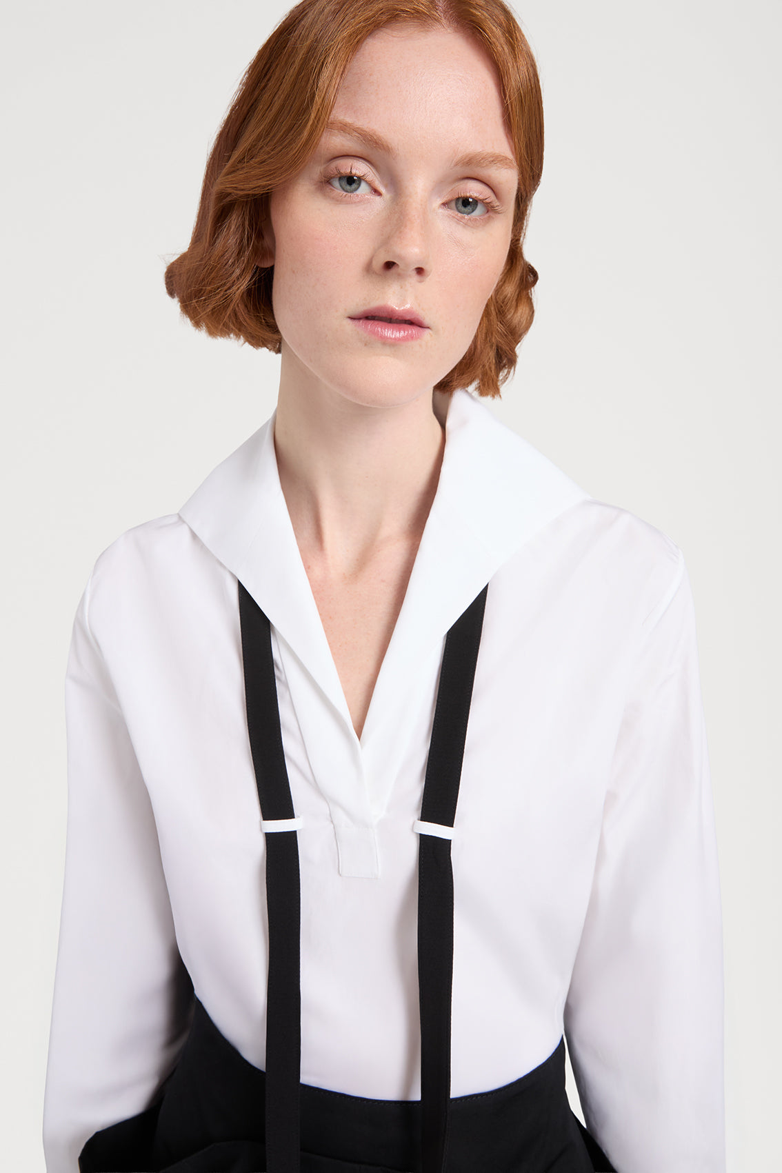 White long-sleeve shirt with a spread collar and distinctive V-neck. Features two prominent black vertical straps, simple cuffs, and a curved hem for a modern, relaxed style.