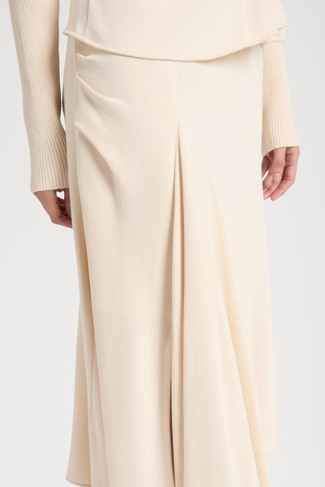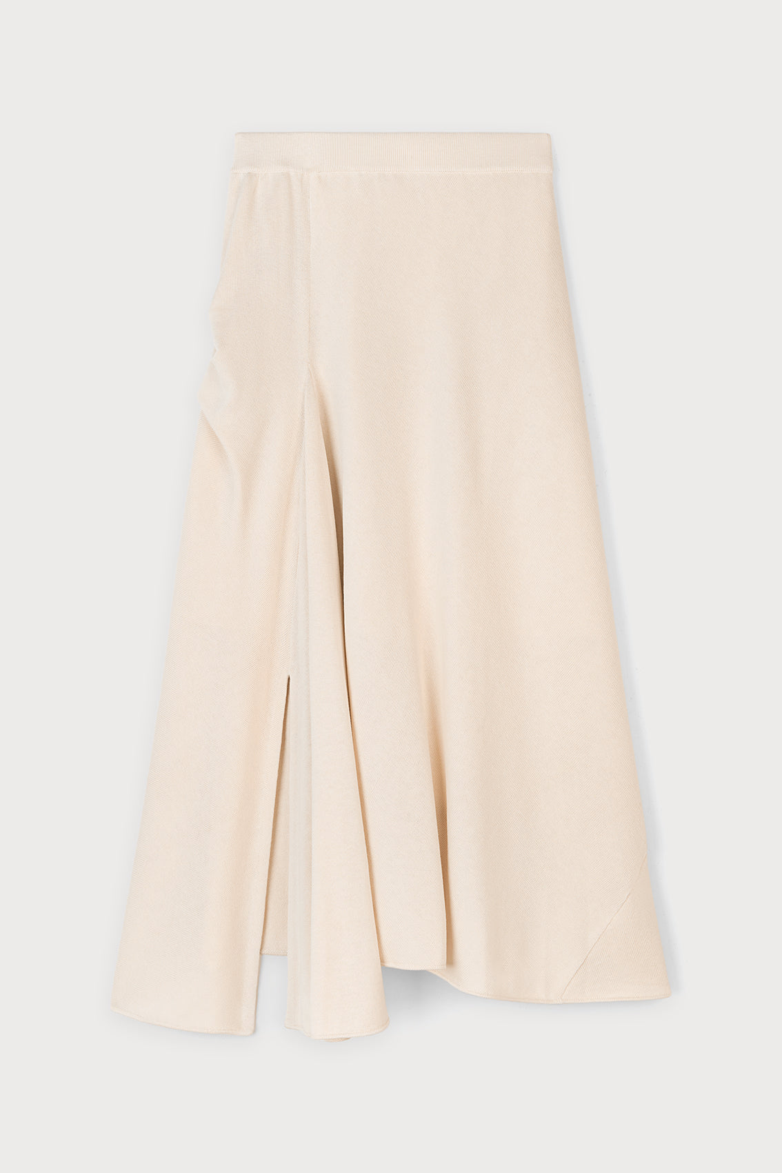 Elegant ivory midi skirt featuring an asymmetrical silhouette with gathered side draping and a high front slit, creating a fluid, modern look with a comfortable waistband.