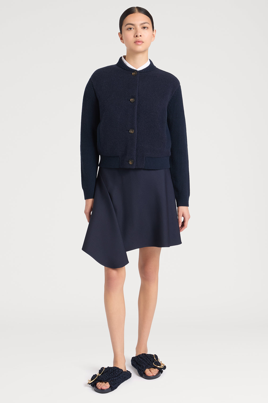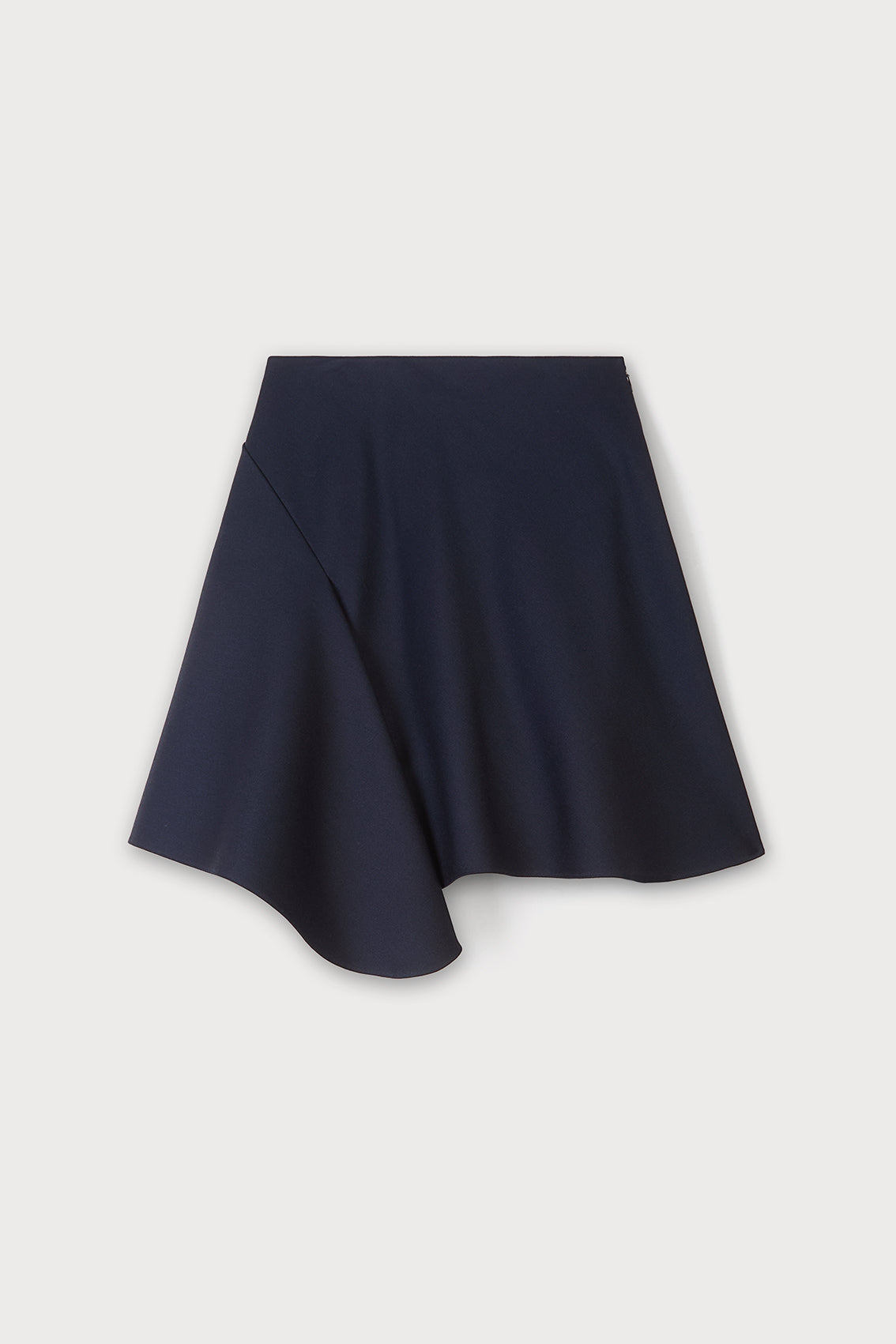 Trendy dark navy mini skirt with an asymmetrical hemline. Made from wool fabric for comfort, offering a modern and chic look for casual outings or parties.