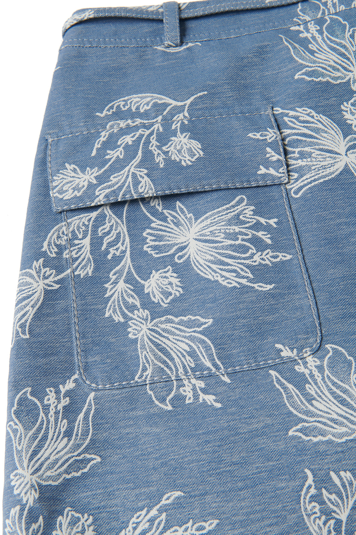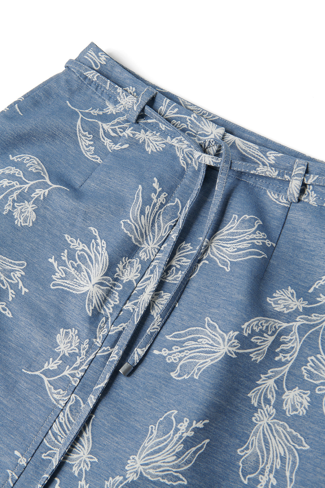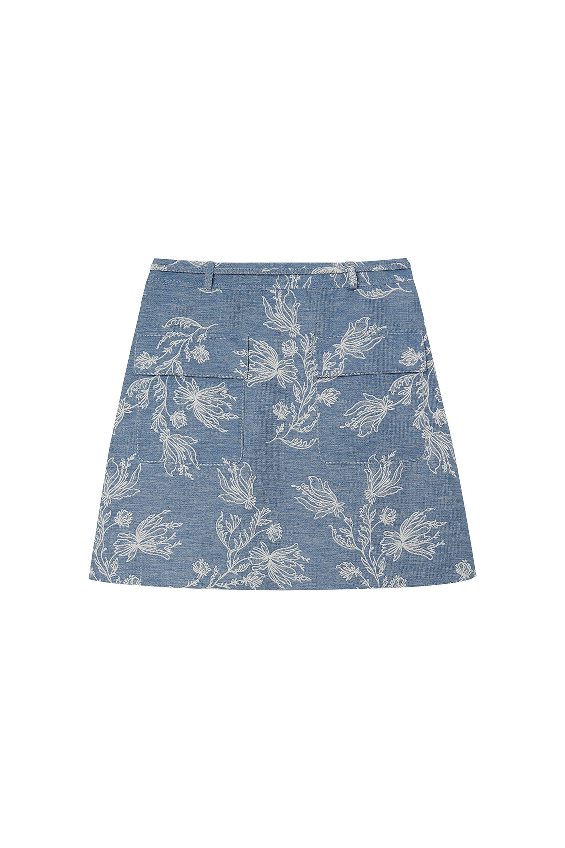 Light blue A-line mini skirt featuring a fresh white floral print. It includes a self-tie belt and belt loops, blending casual style with elegant botanical details.
