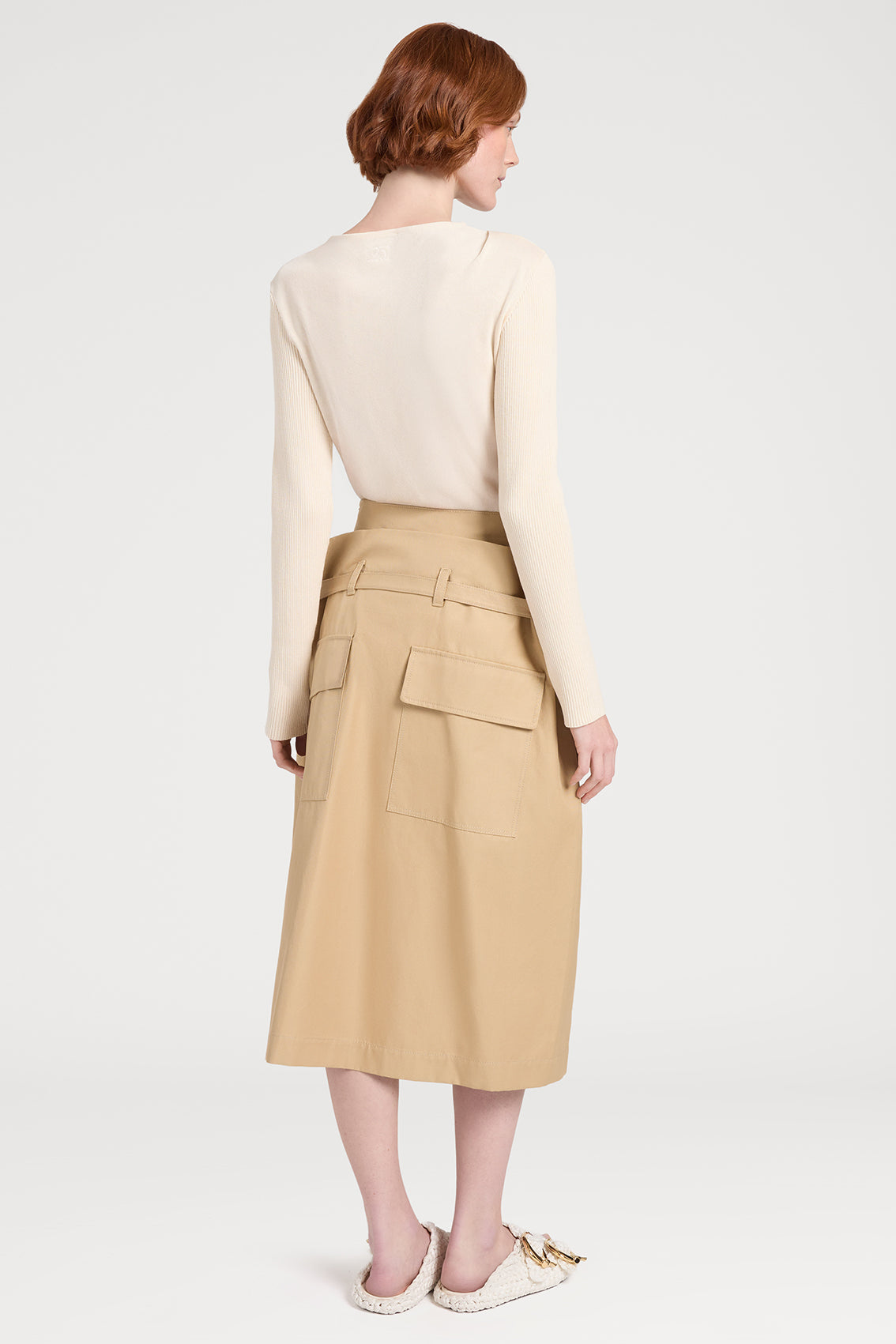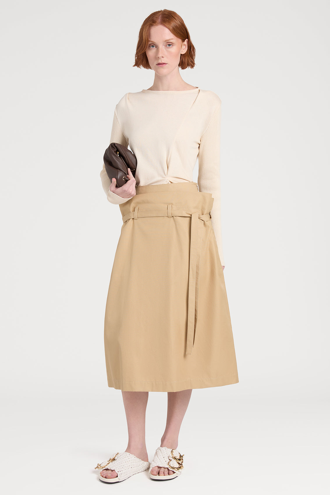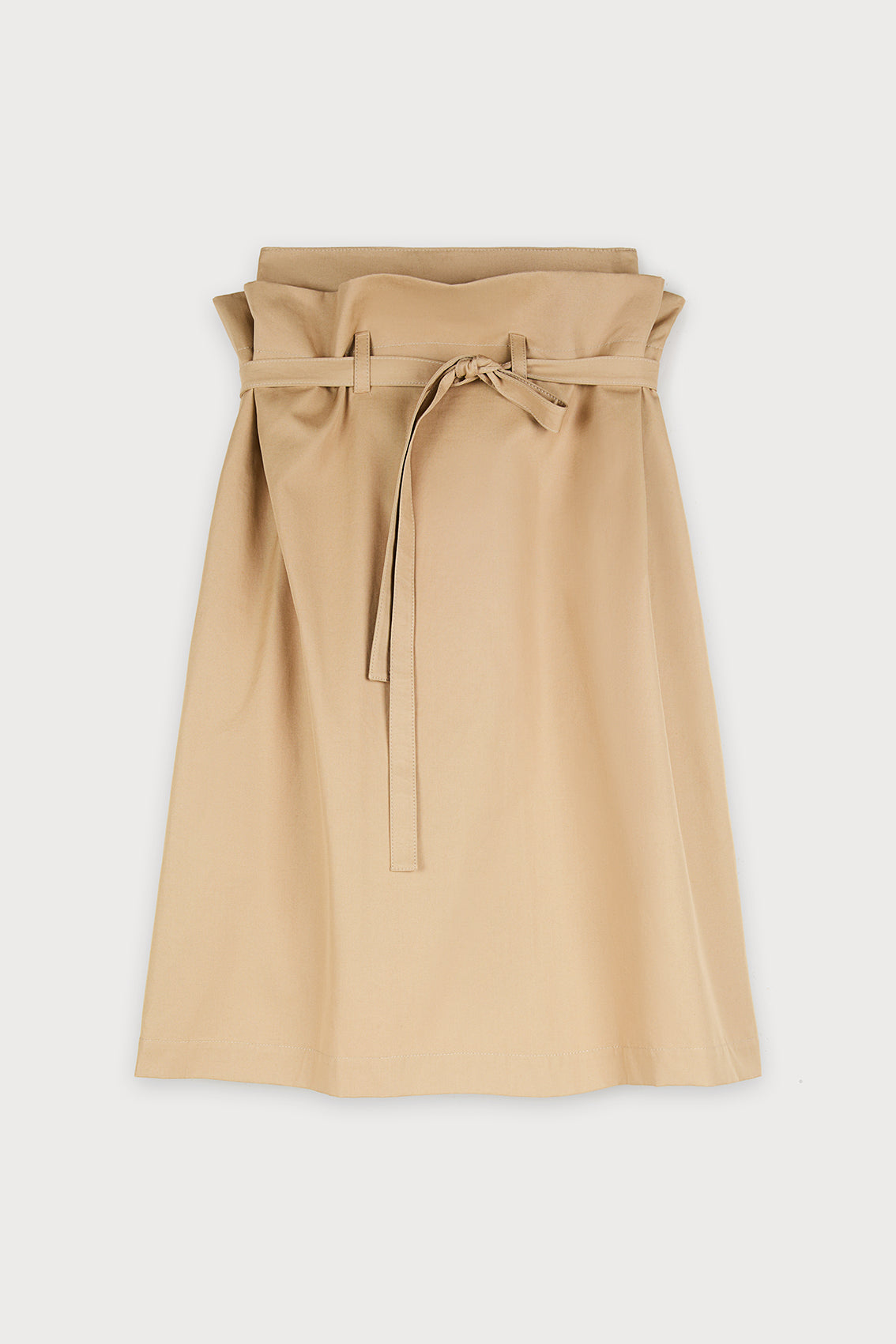 This chic tan midi skirt boasts a fashionable paperbag waist with a self-tie belt. Its comfortable, flowing silhouette makes it a versatile wardrobe essential.