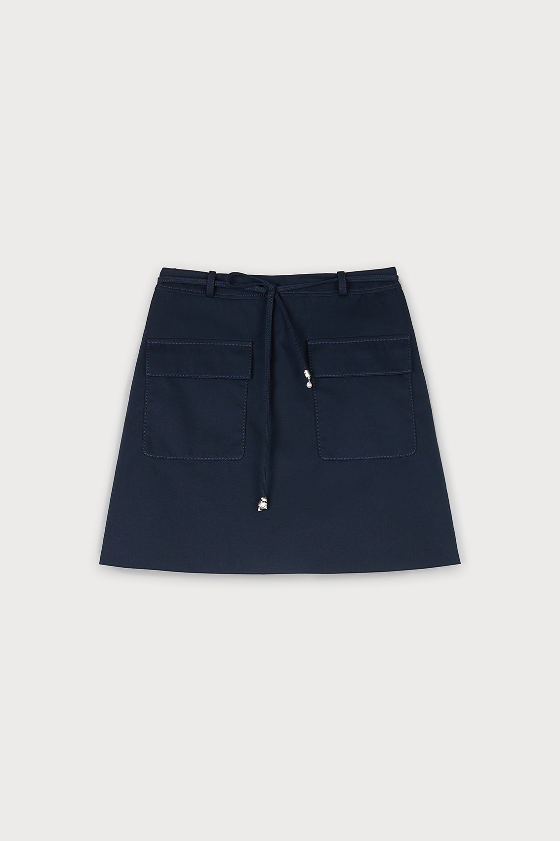 Casual dark navy mini skirt featuring functional front pockets and a drawstring waist. Made from cotton fabric, it blends style with practicality for everyday wear.