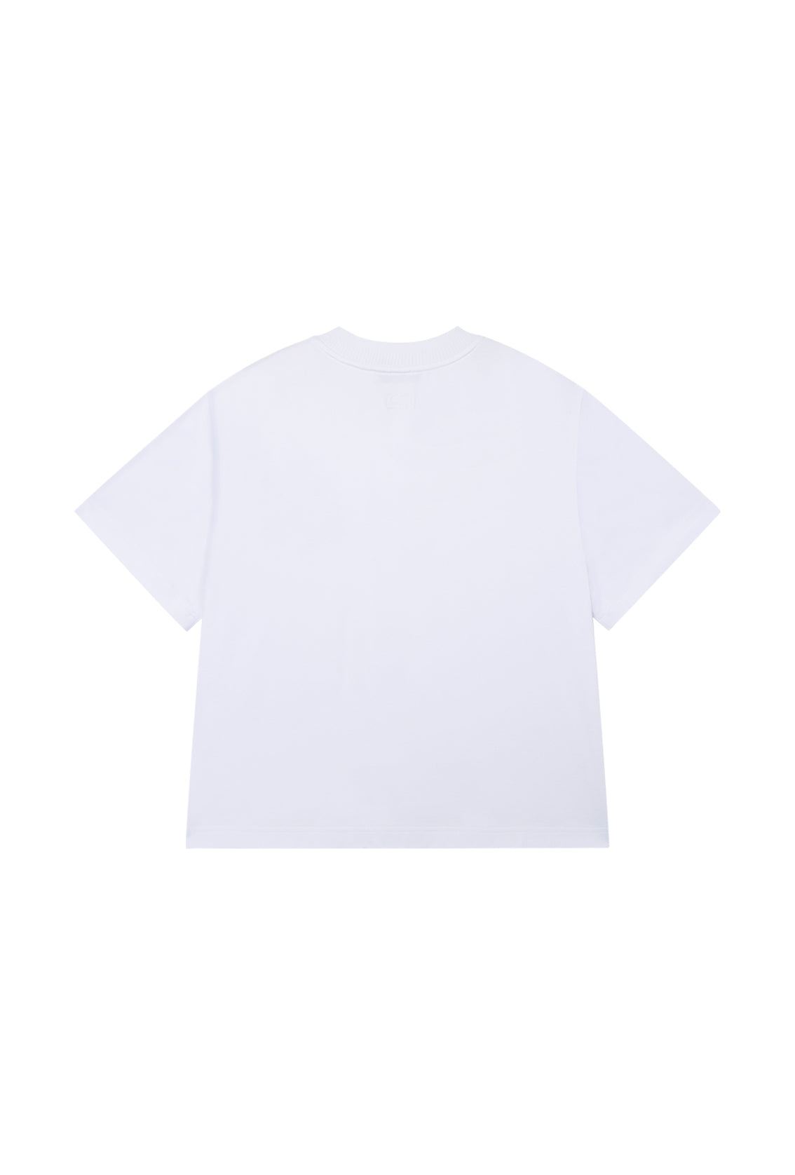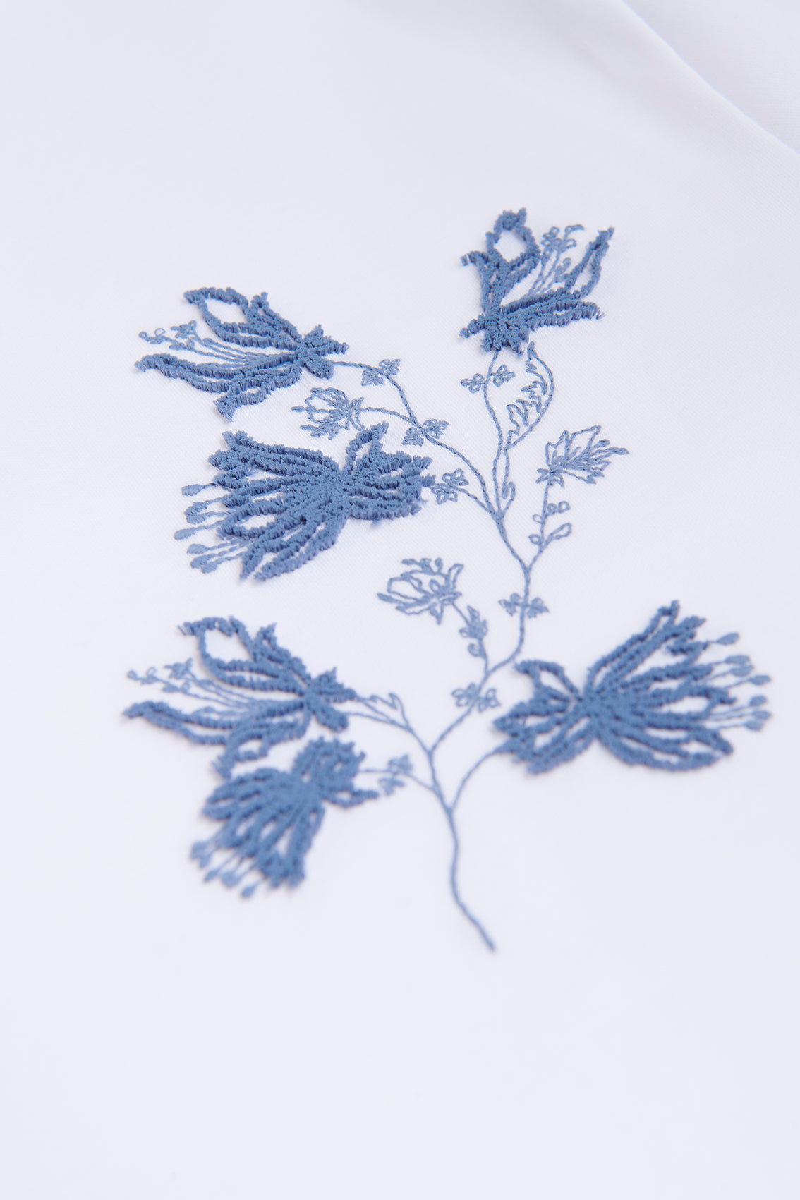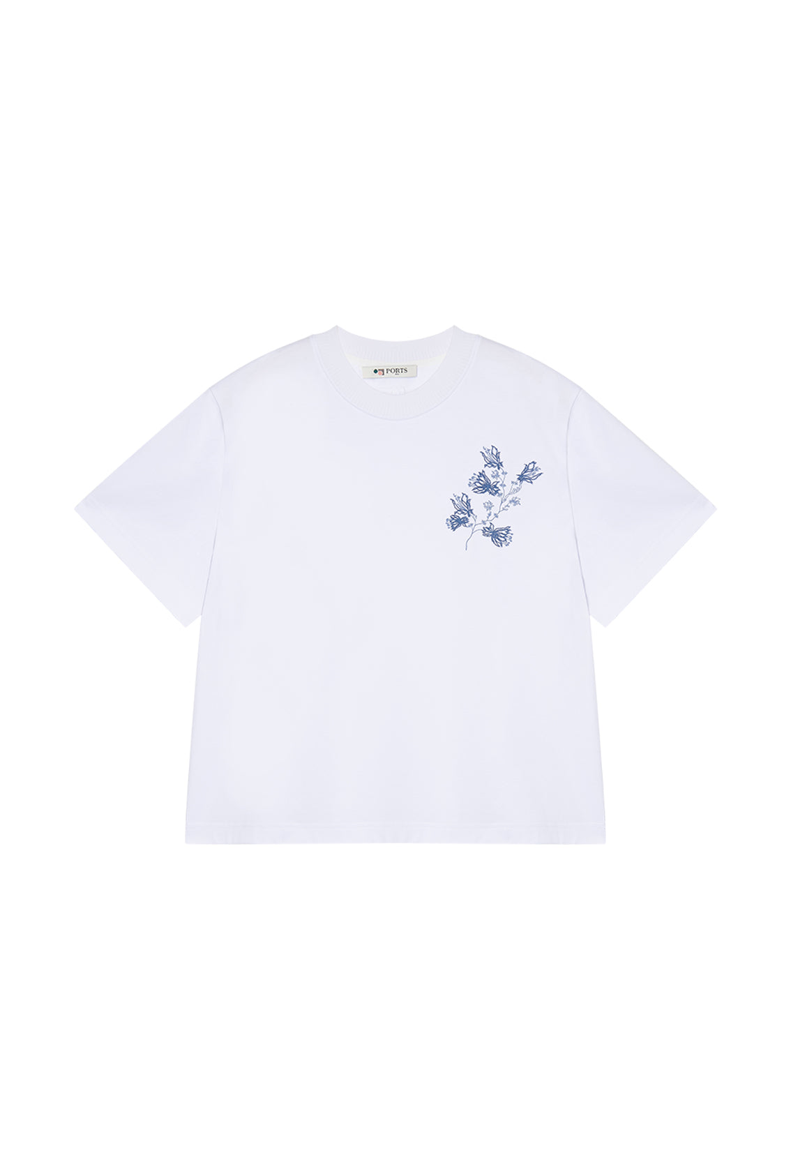 This classic white short-sleeve t-shirt features a crew neckline and a relaxed fit. It is accented with a delicate blue floral graphic embroidered on the left chest.