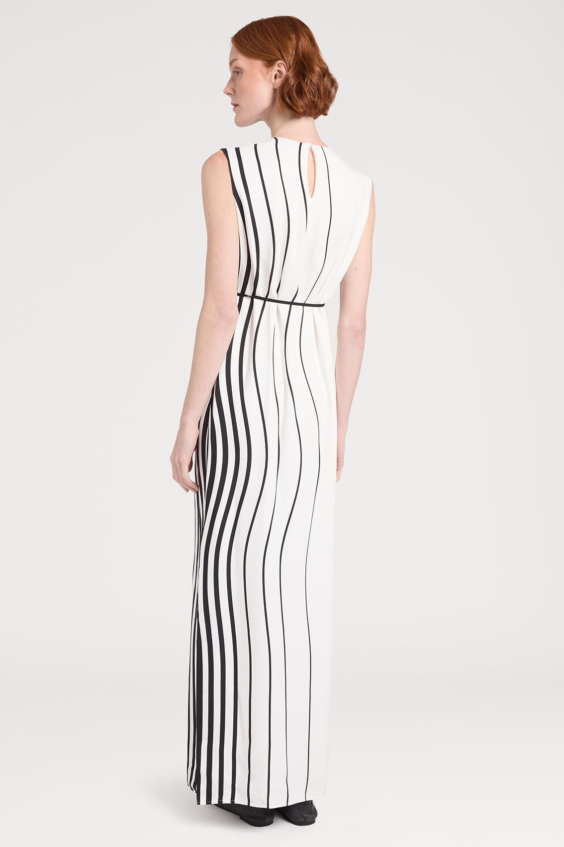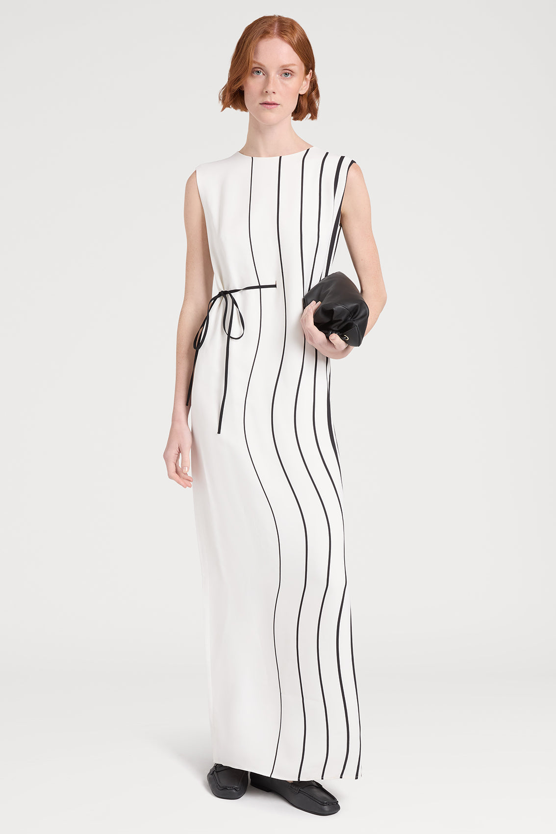 This sleeveless white dress features a striking asymmetrical design with vertical black wavy stripes, a crew neckline, and a decorative black tie belt at the waist for added definition.
