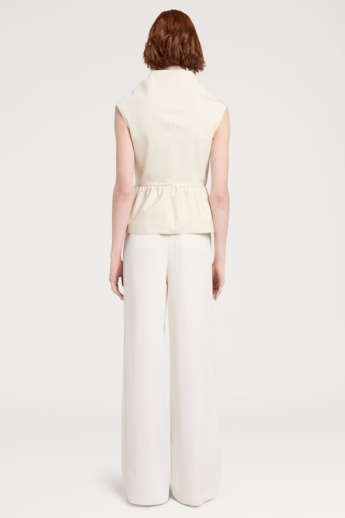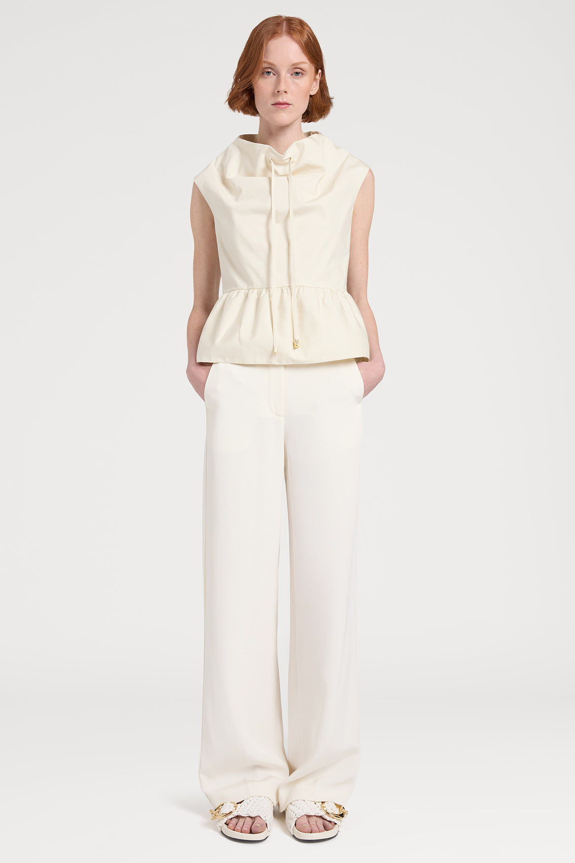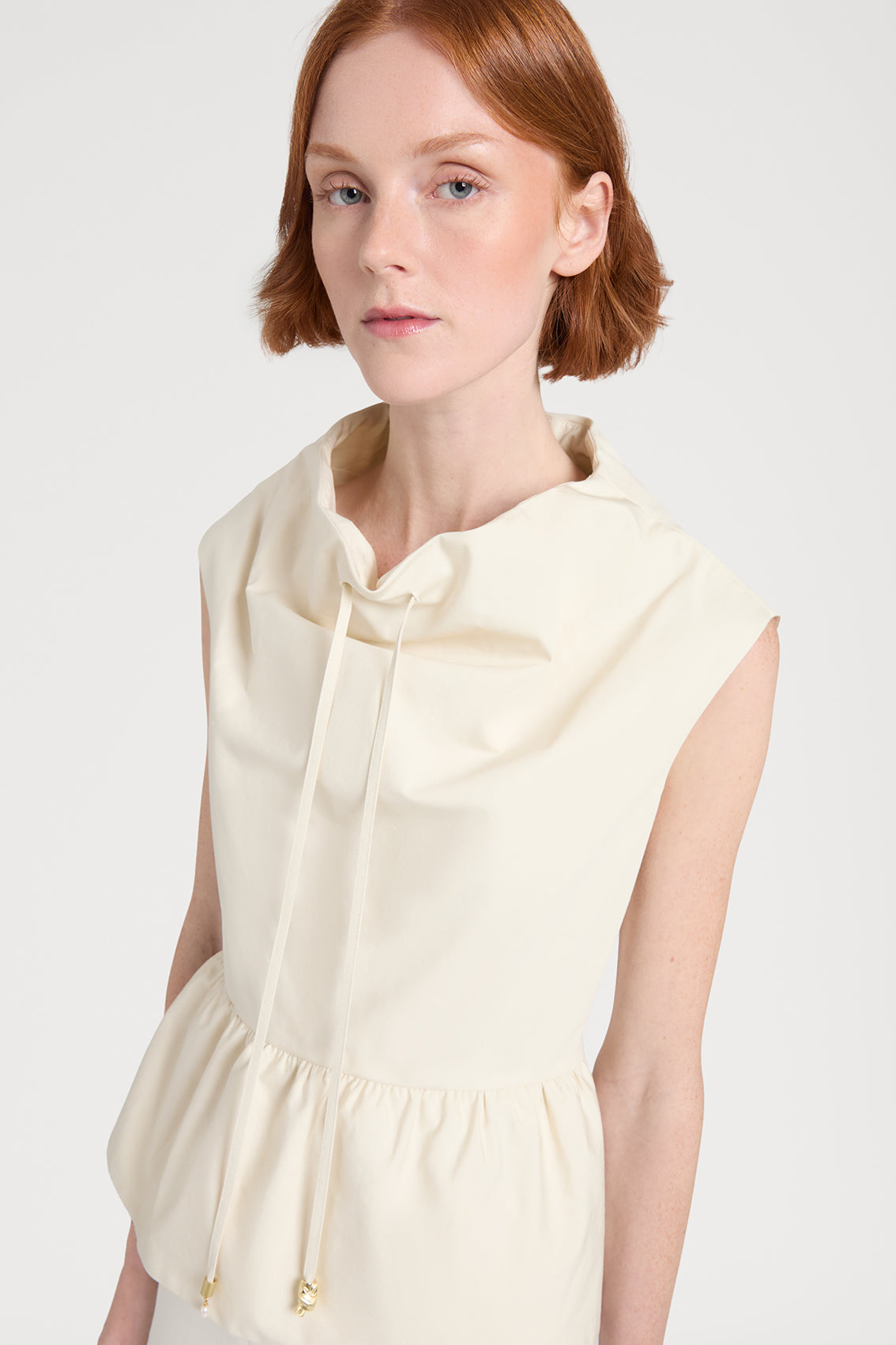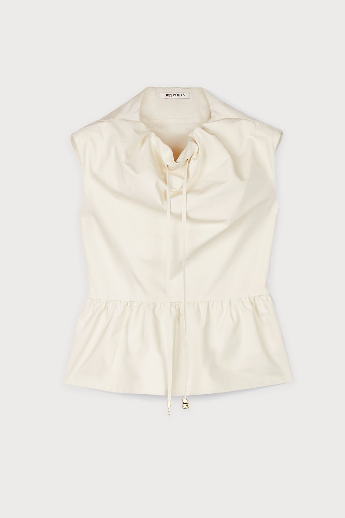 This sleeveless top featuring a draped neckline with a central drawstring detail and a gathered peplum hem. This elegant design offers an adjustable, flattering silhouette.