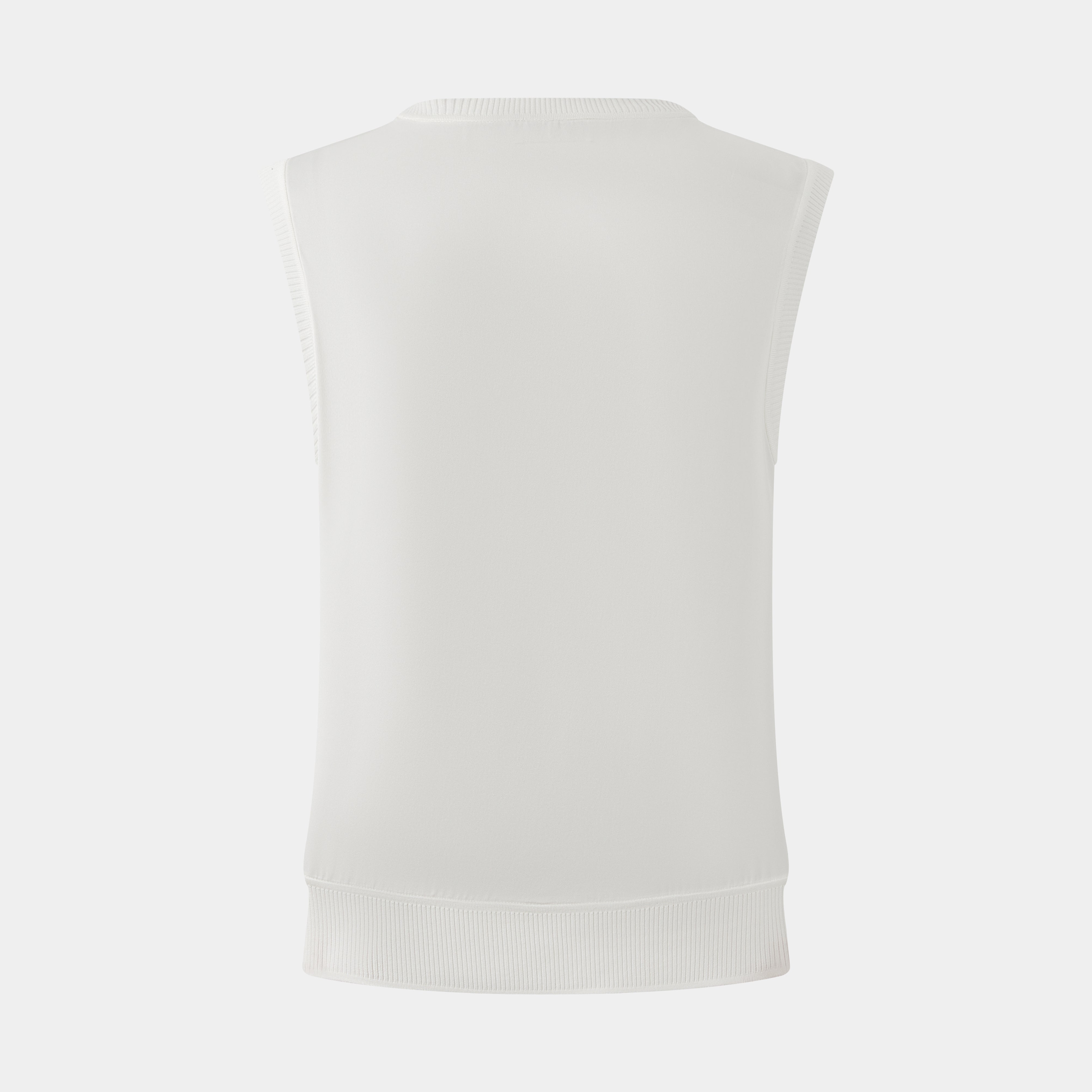 Sleeveless knit top with delicate lace-like front texture, smooth back panel, wide crew neckline, and ribbed hem, offering a refined, lightweight layering piece with subtly structured silhouette.