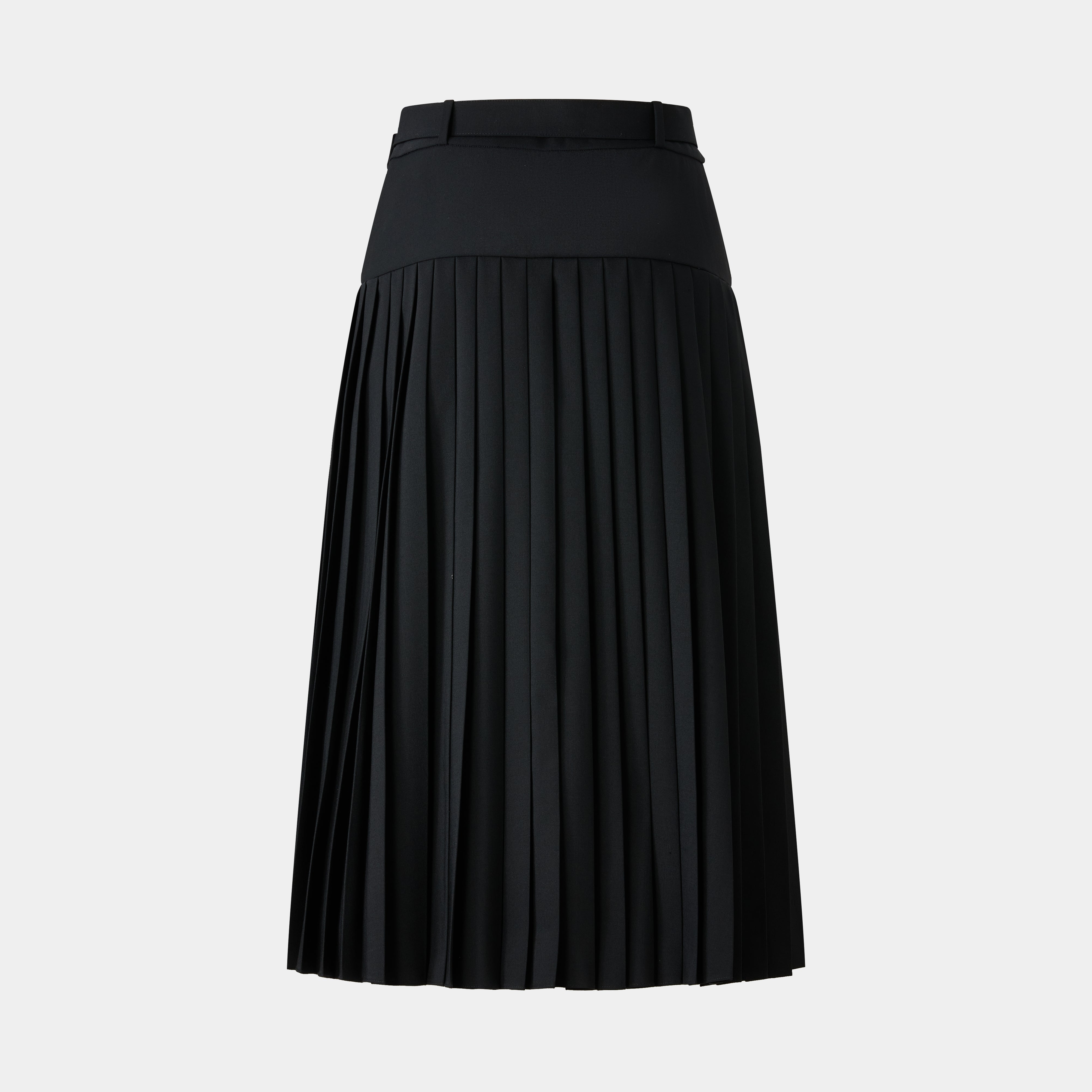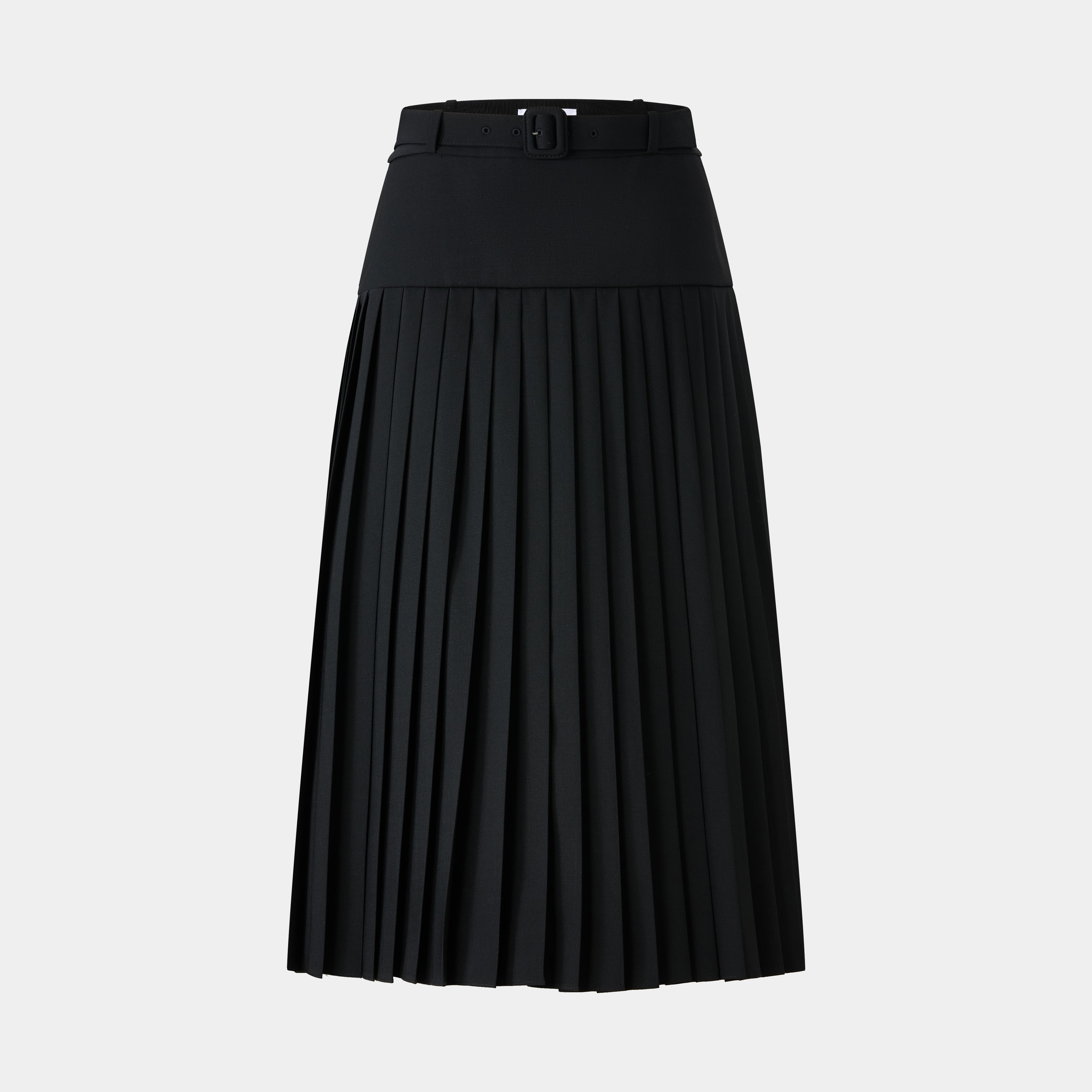 This elegant black midi skirt features a wide, belted high waistband with a matching buckle, transitioning into crisp, full pleats. A sophisticated and timeless piece.