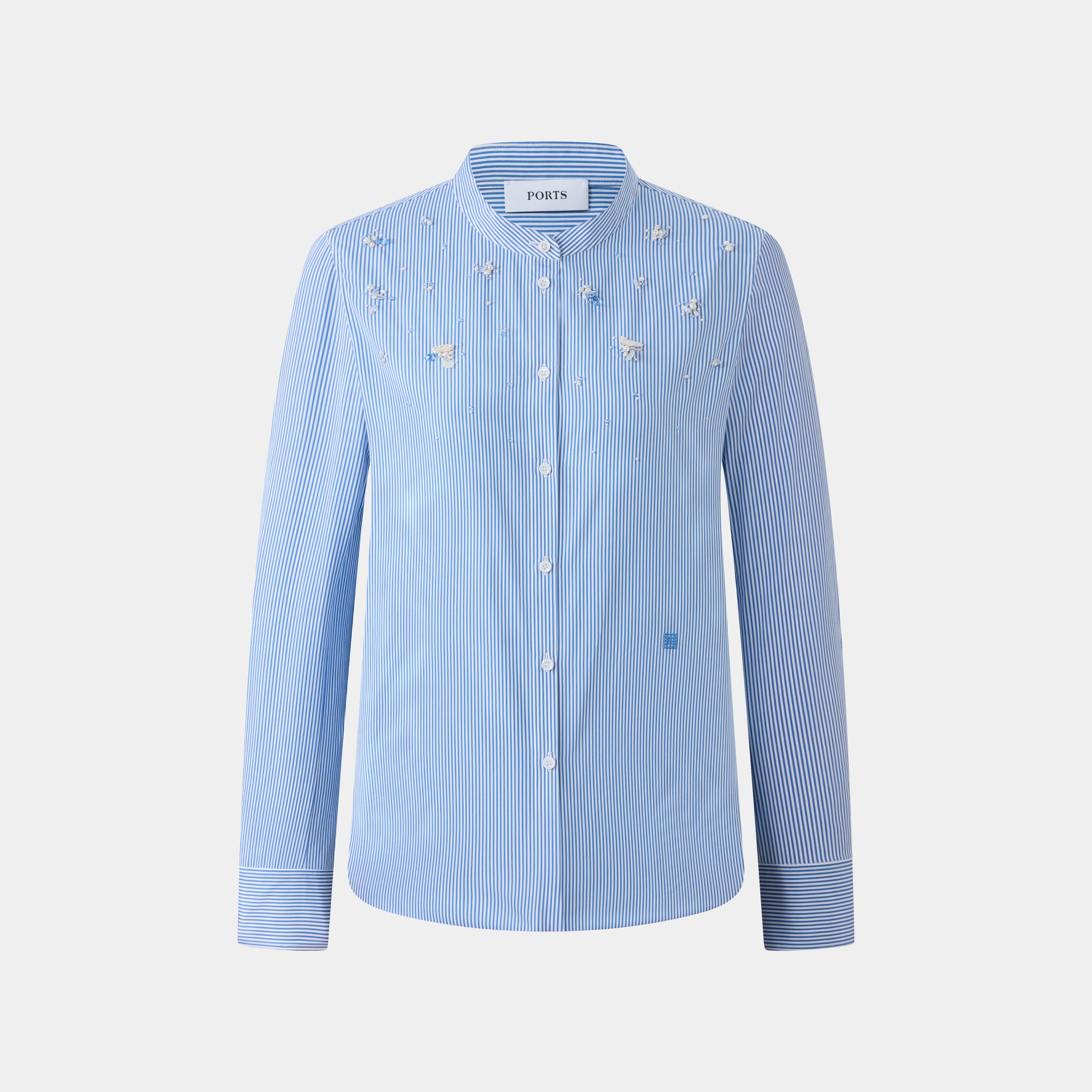 This elegant striped shirt features a chic band collar and is adorned with delicate floral and beaded appliqués. It has long sleeves with contrasting striped cuffs.