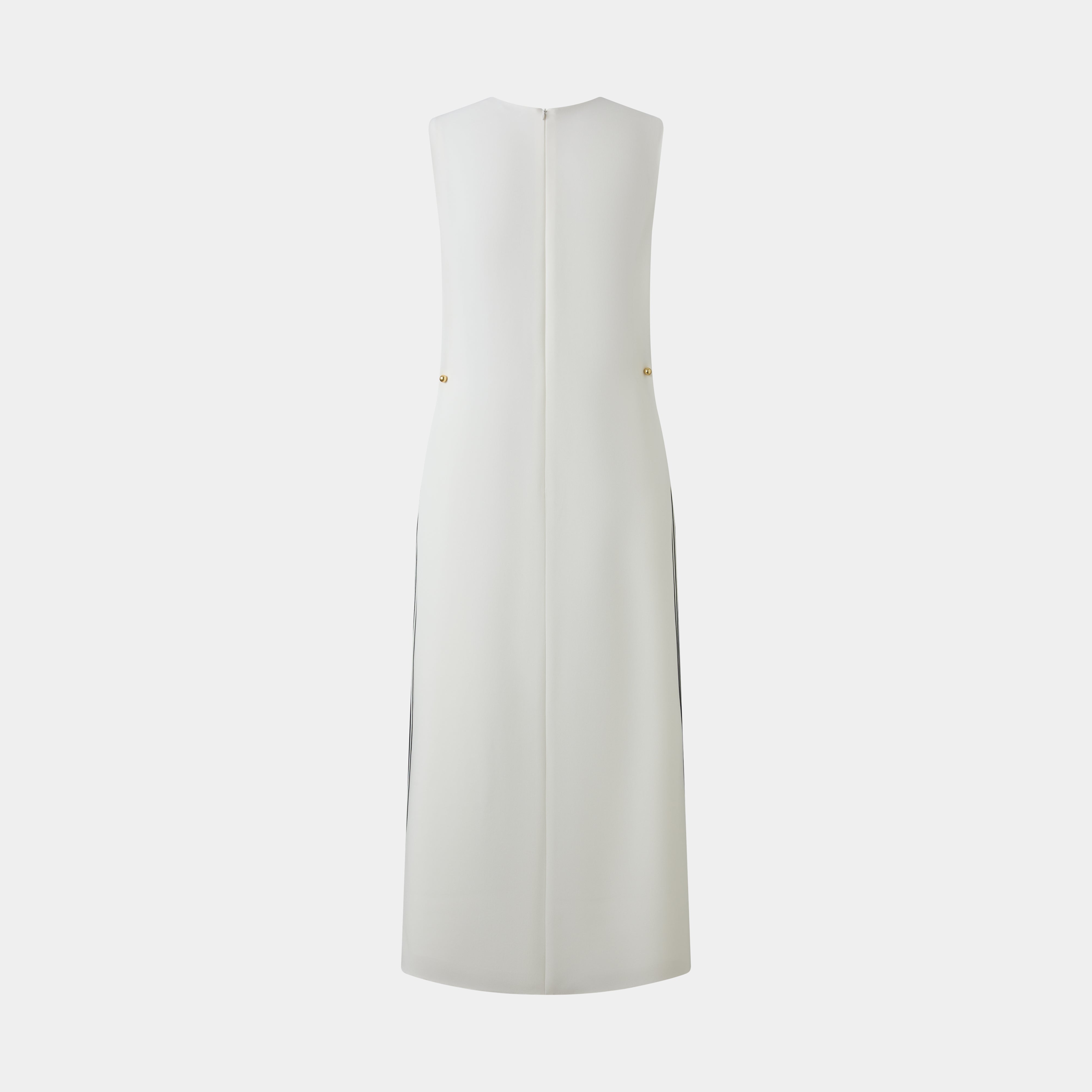 Sleeveless V-neck column dress with a sleek silhouette. Features subtle side pleating and delicate gold-toned decorative accents, adding a refined and modern touch.