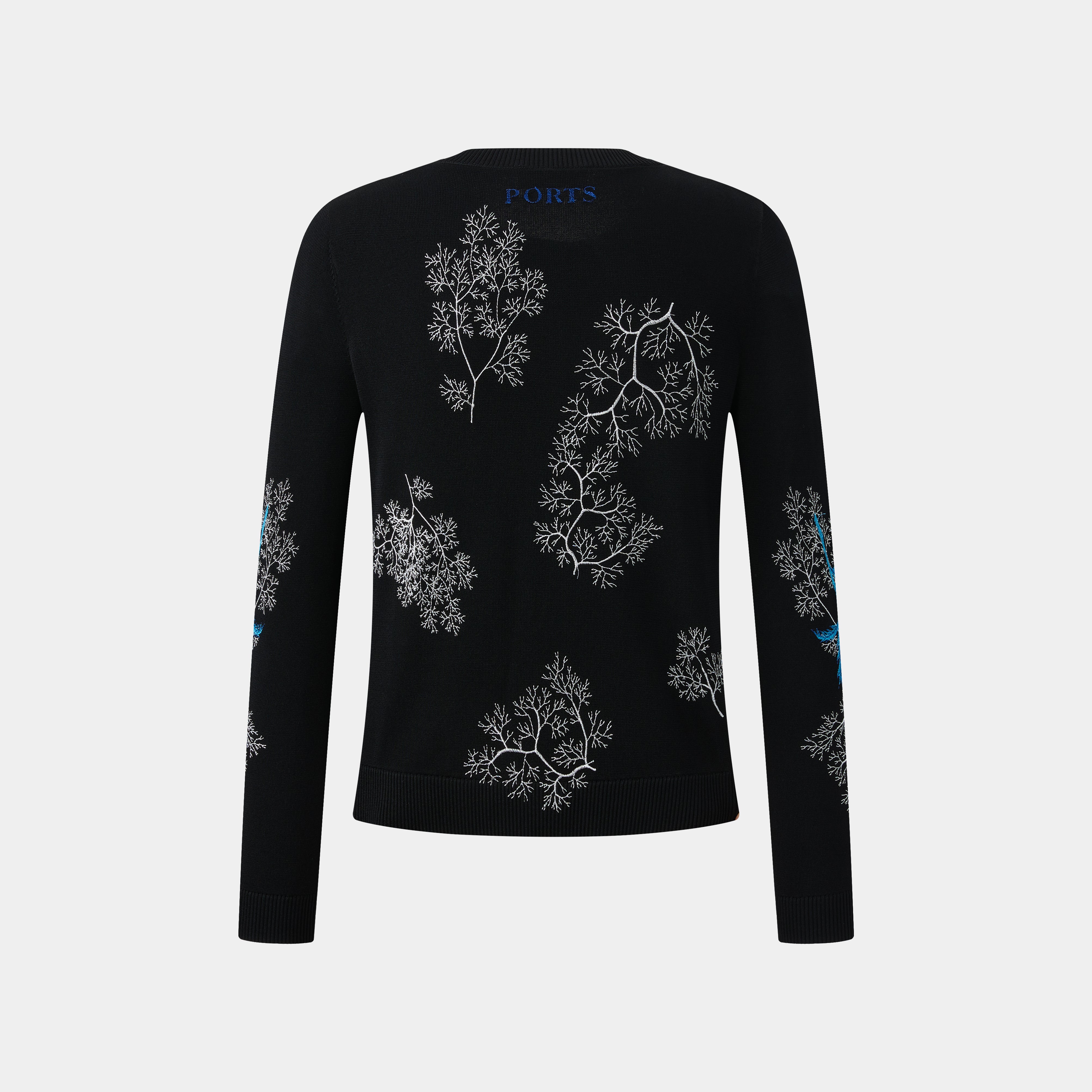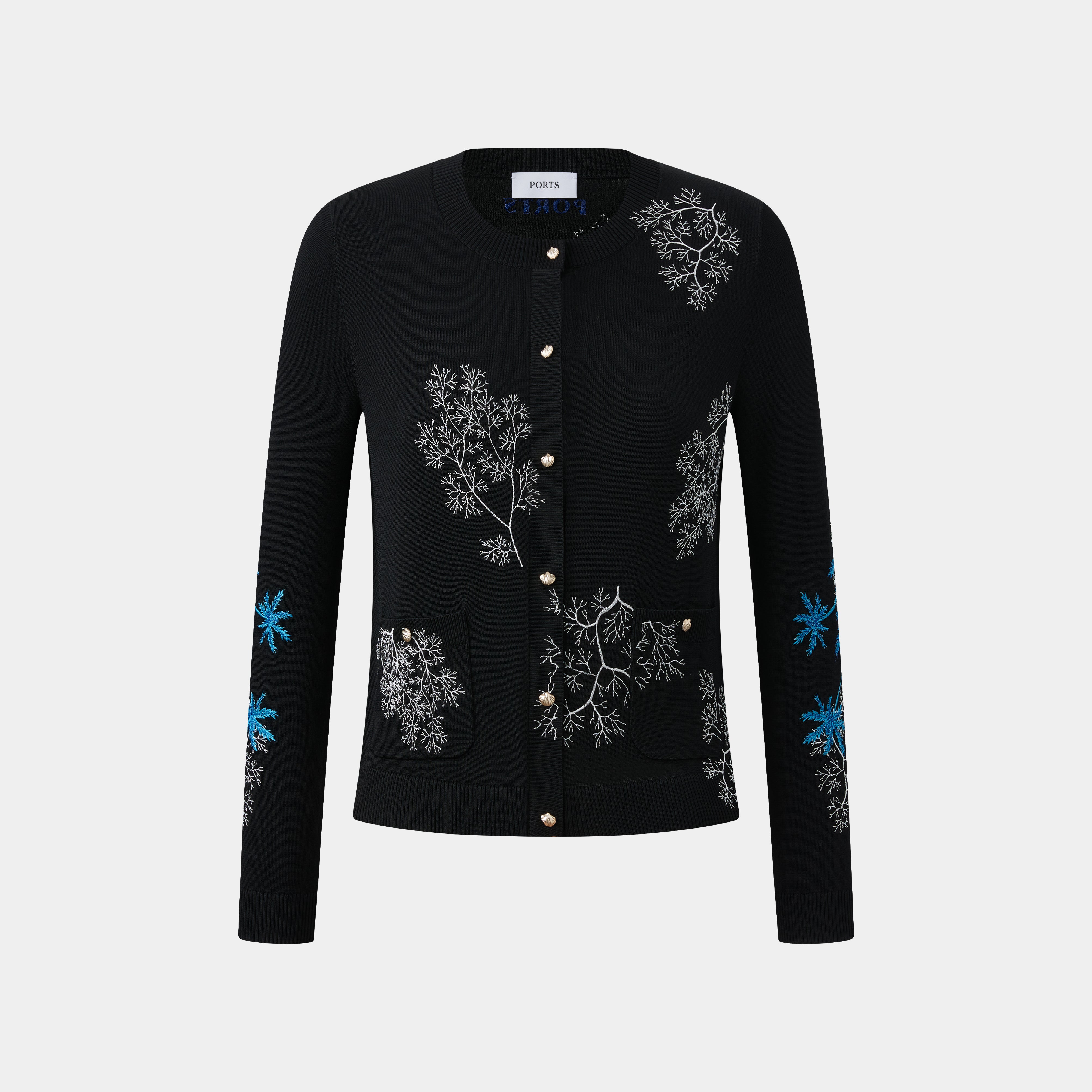 Elegant knit cardigan featuring intricate coral-like embroidery throughout, a round neck, and long sleeves. It has a full button-front with ornate shell buttons and two delicate patch pockets.