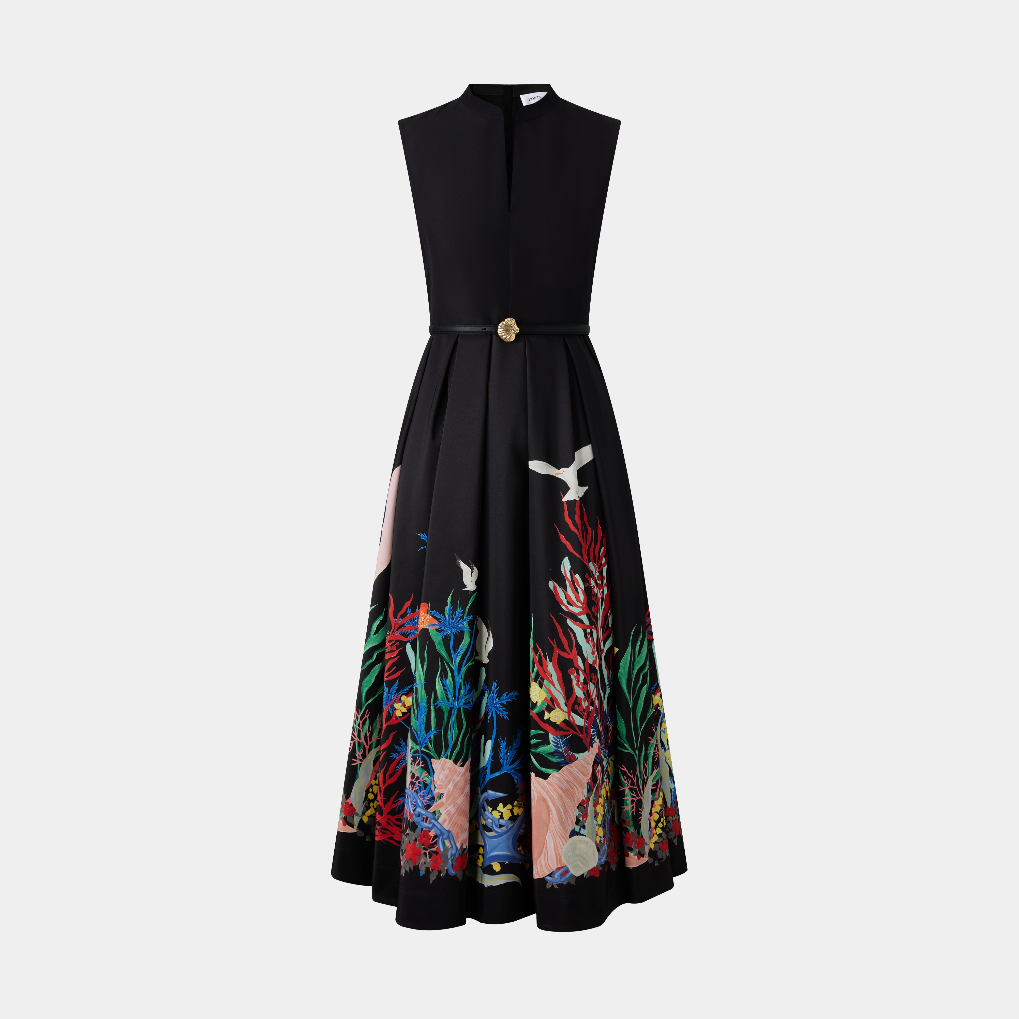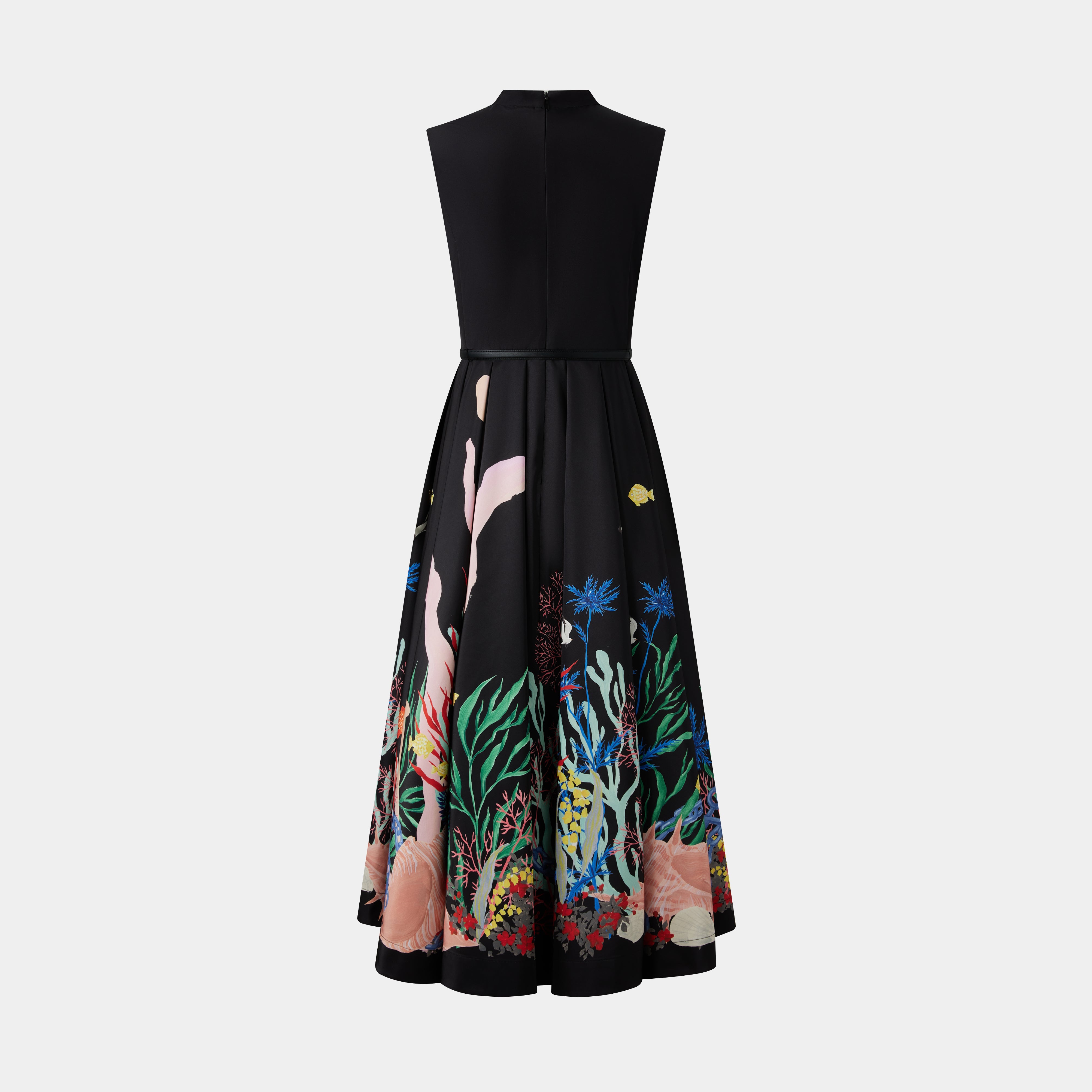 Sleeveless midi dress featuring a sophisticated mandarin collar and V-neck. A shell-buckle belt cinches the waist, complementing the vibrant, detailed marine life print on the full skirt.