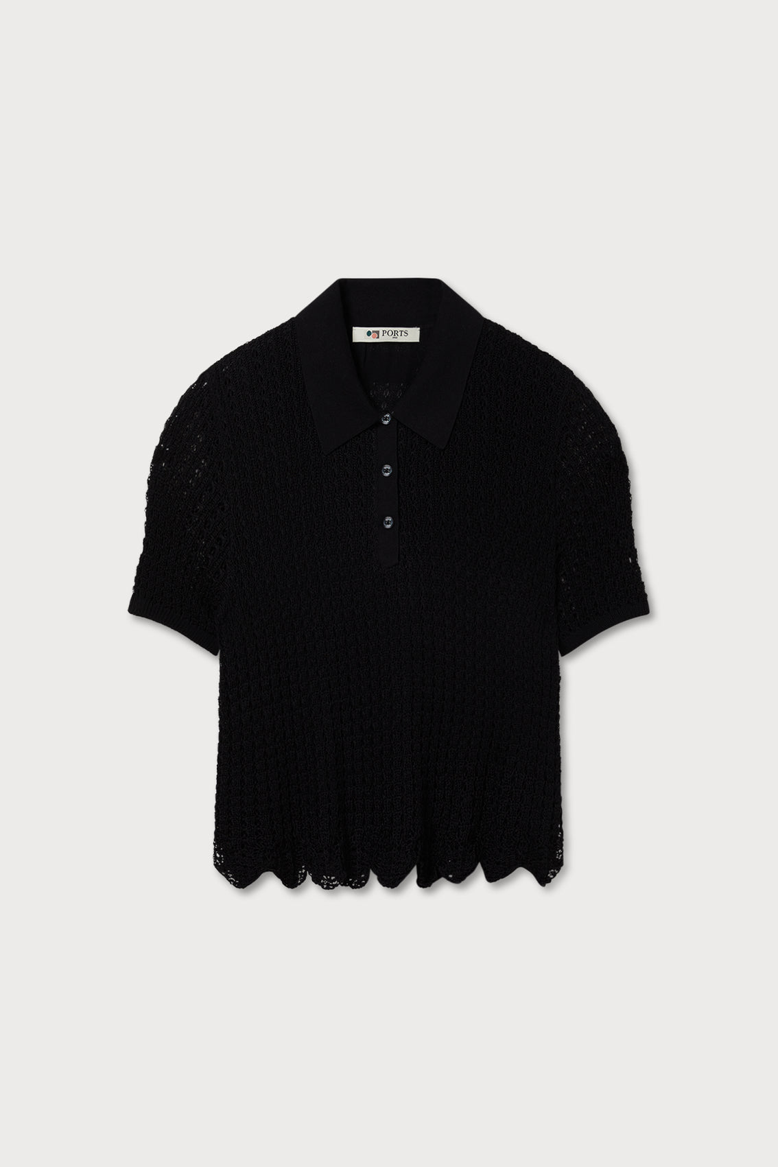 A short-sleeved collared knit top with an openwork pattern, button placket, and scalloped hem.