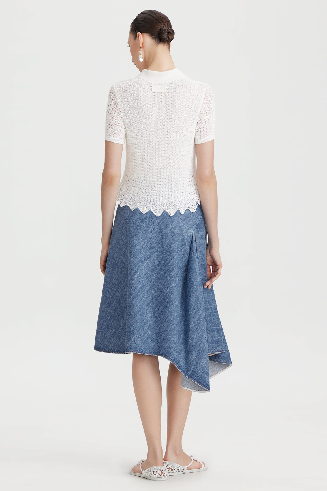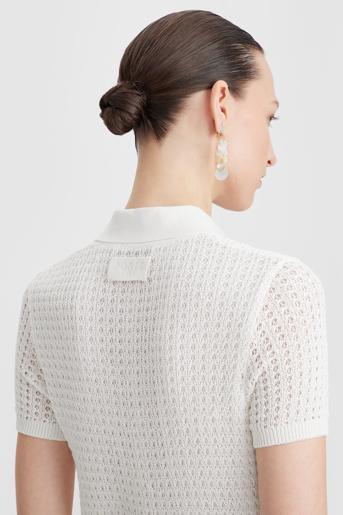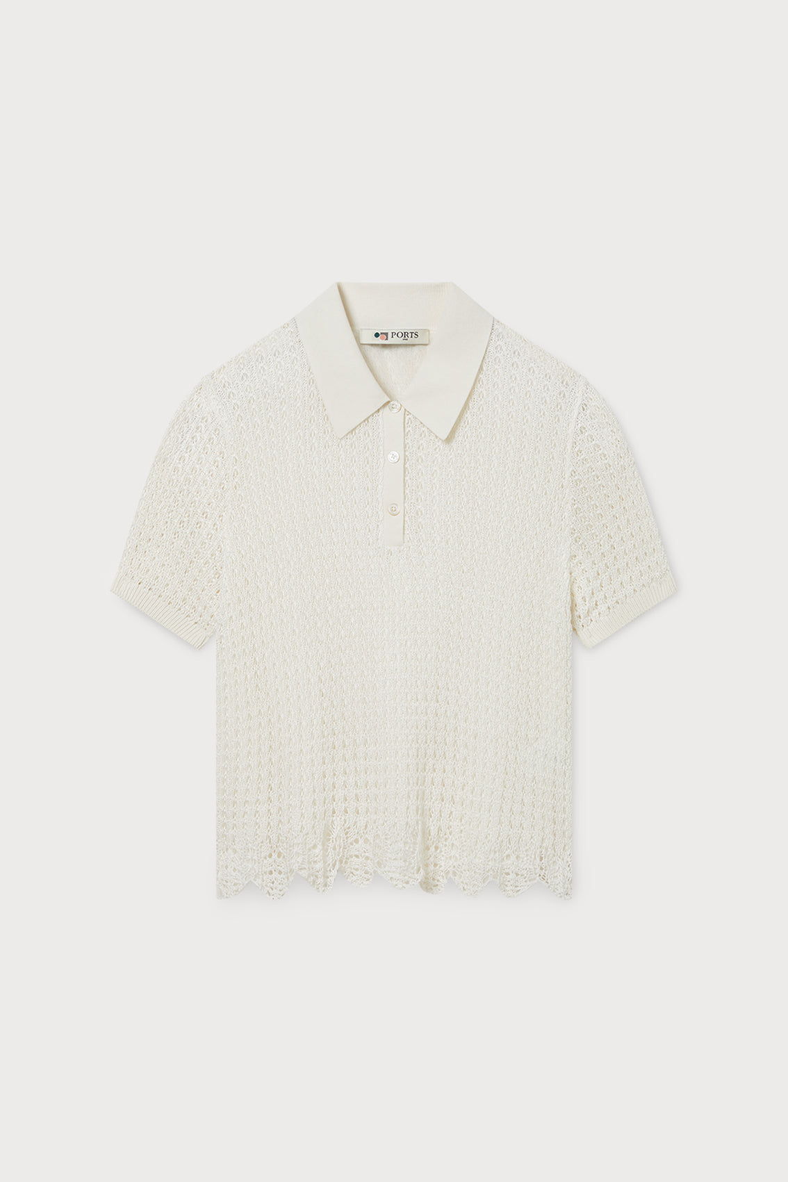 A short-sleeved collared knit top with an openwork pattern, button placket, and scalloped hem.