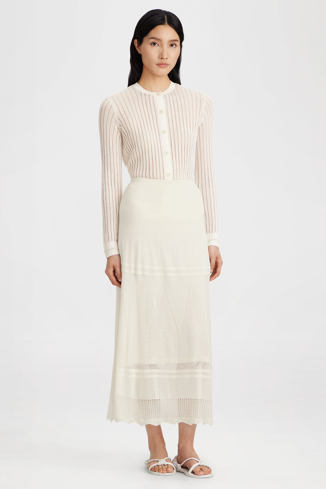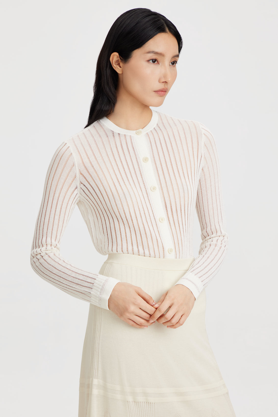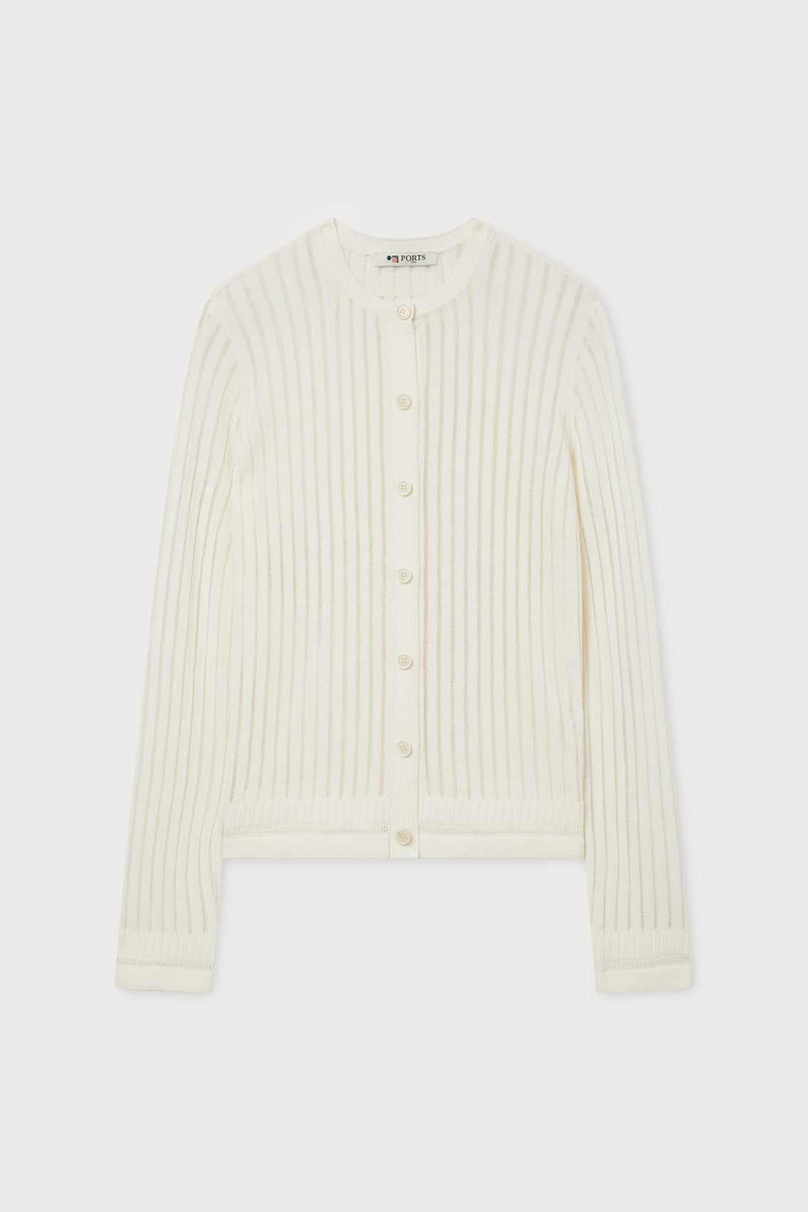 A short button-front cardigan with vertical stripes, round neck, long sleeves, and ribbed trim.