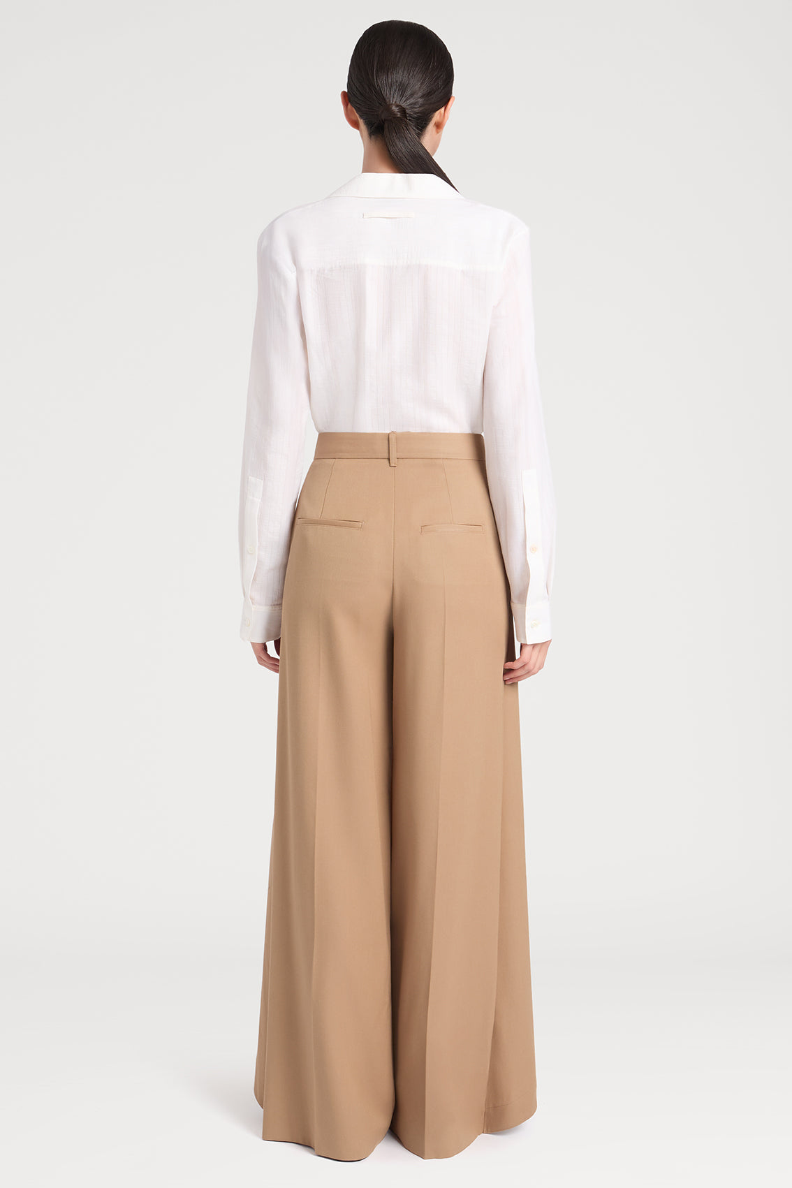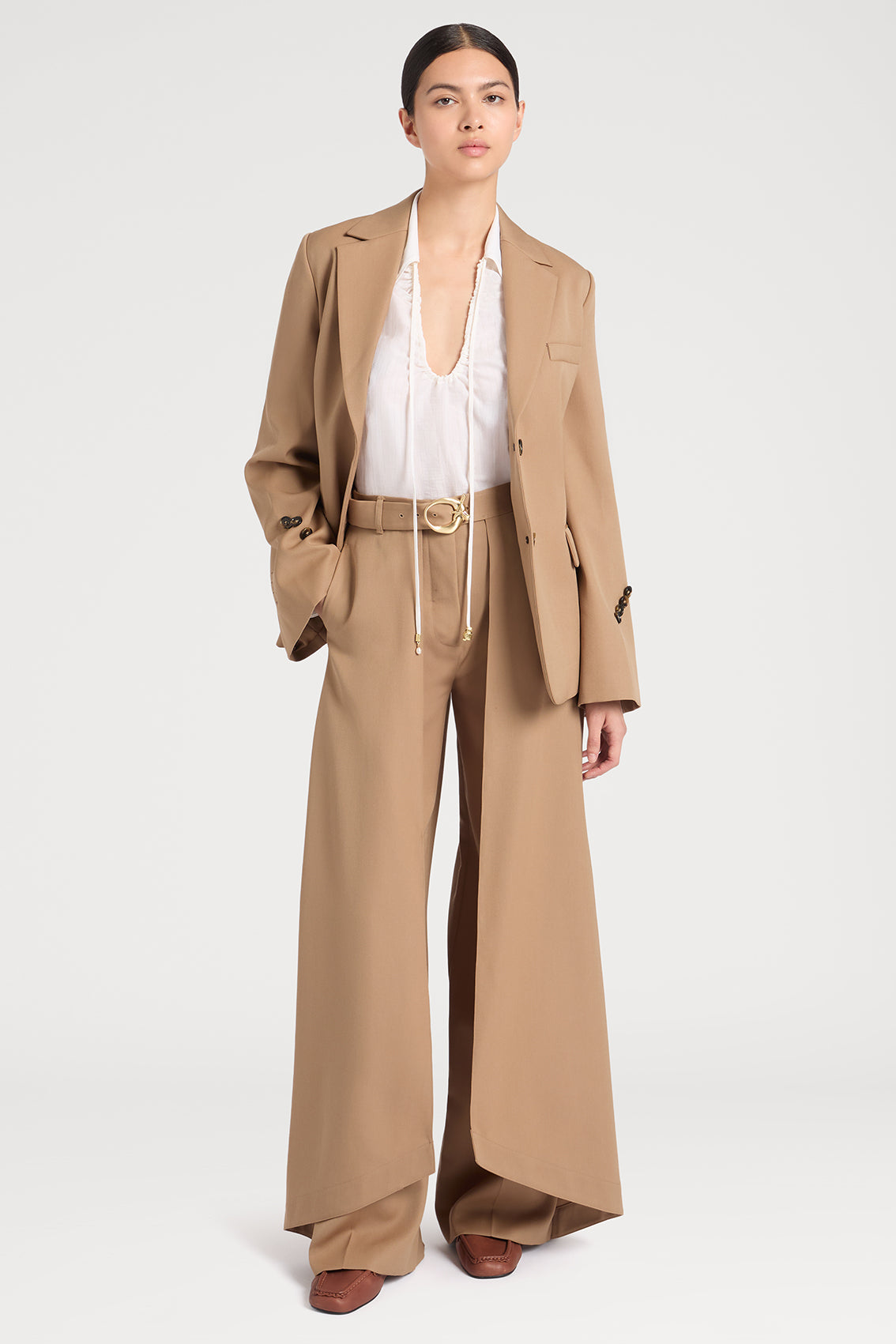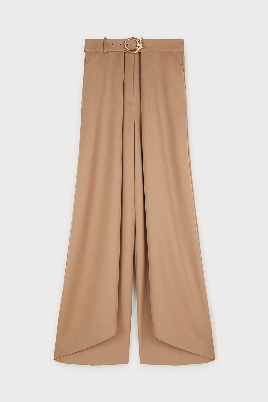 Camel high-waisted wide-leg trousers with dramatic layered front panels, matching belt featuring round gold buckle, subtle pleats, side pockets, tailored yet statement design for elevated contemporary outfits.