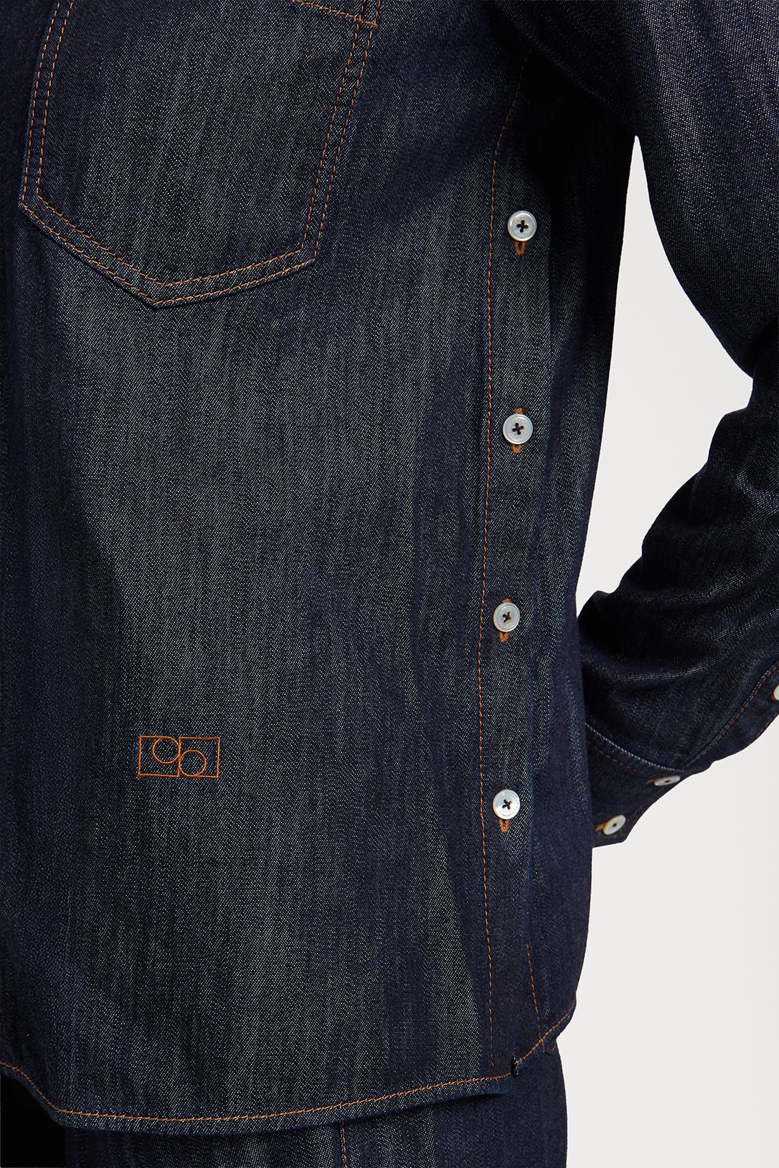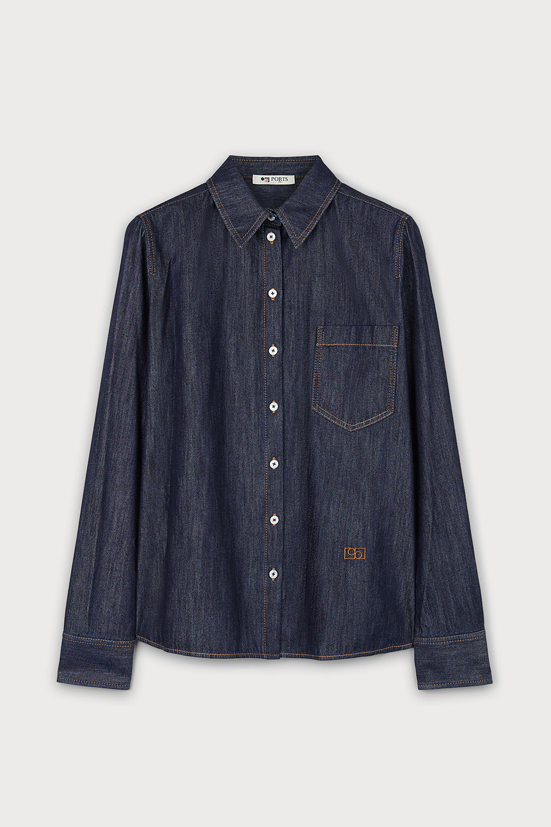 This classic dark wash denim shirt features white buttons, contrast tobacco stitching, a chest pocket, and an embroidered "1961" detail, offering a versatile, timeless style.