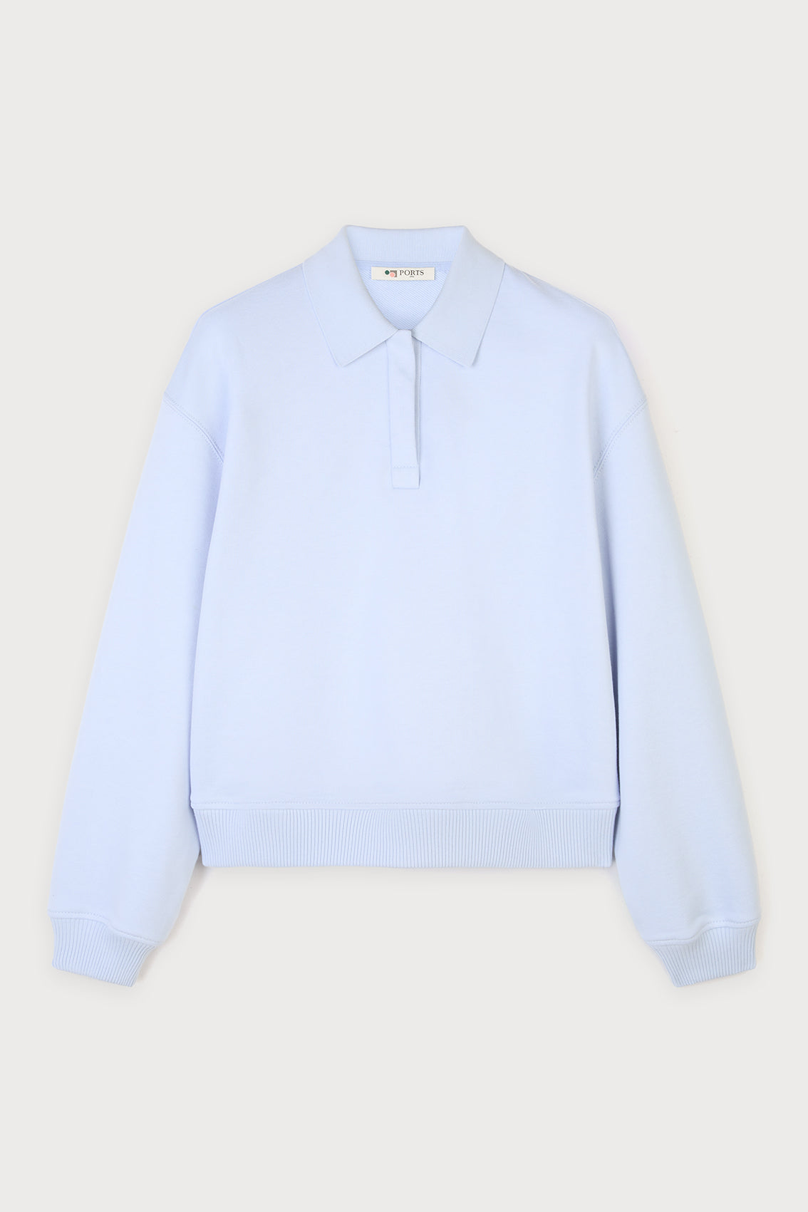 Minimalist white sweatshirt featuring a classic polo collar and hidden placket. Designed with a boxy silhouette, dropped shoulders, and wide ribbed trims at the hem and cuffs.