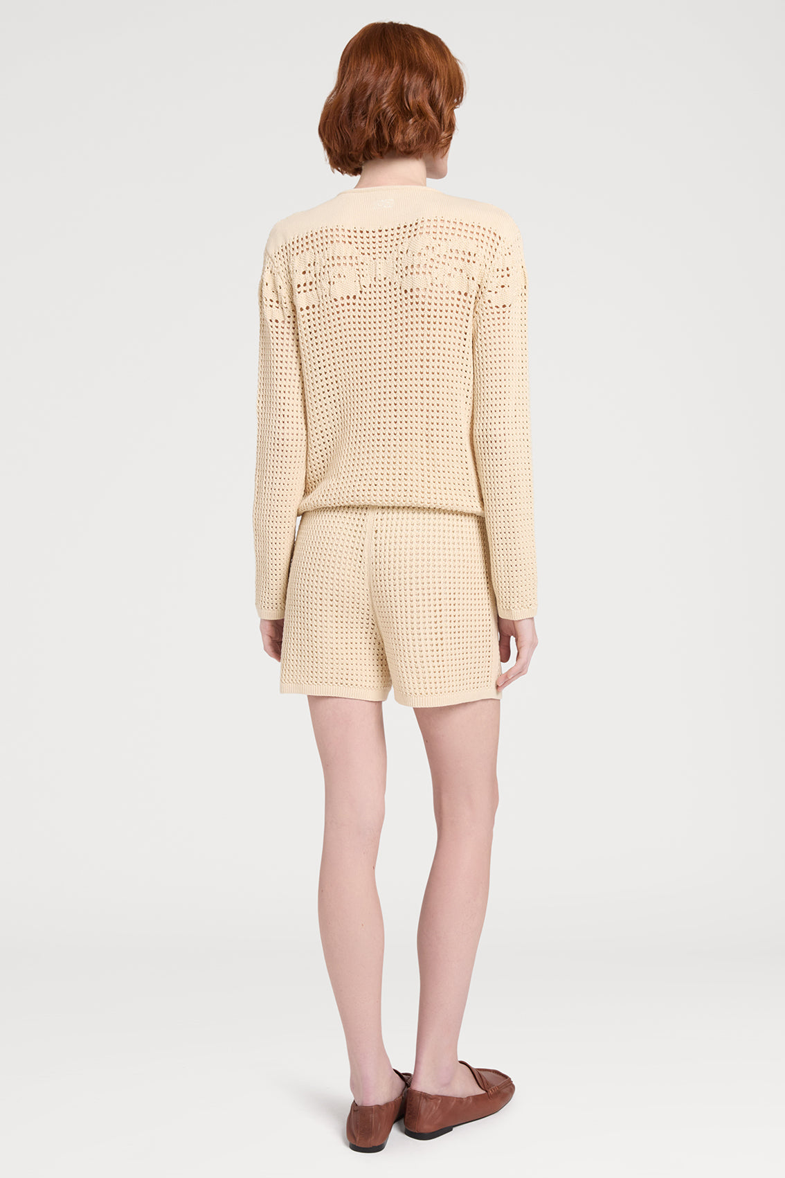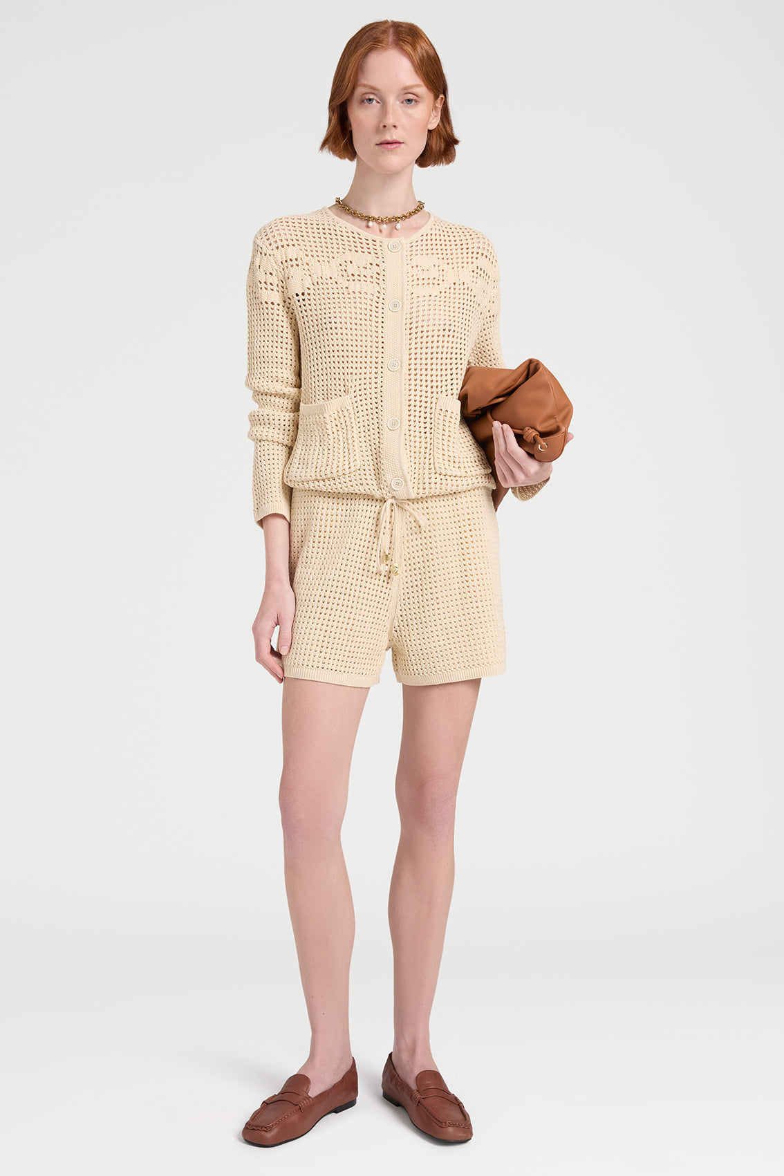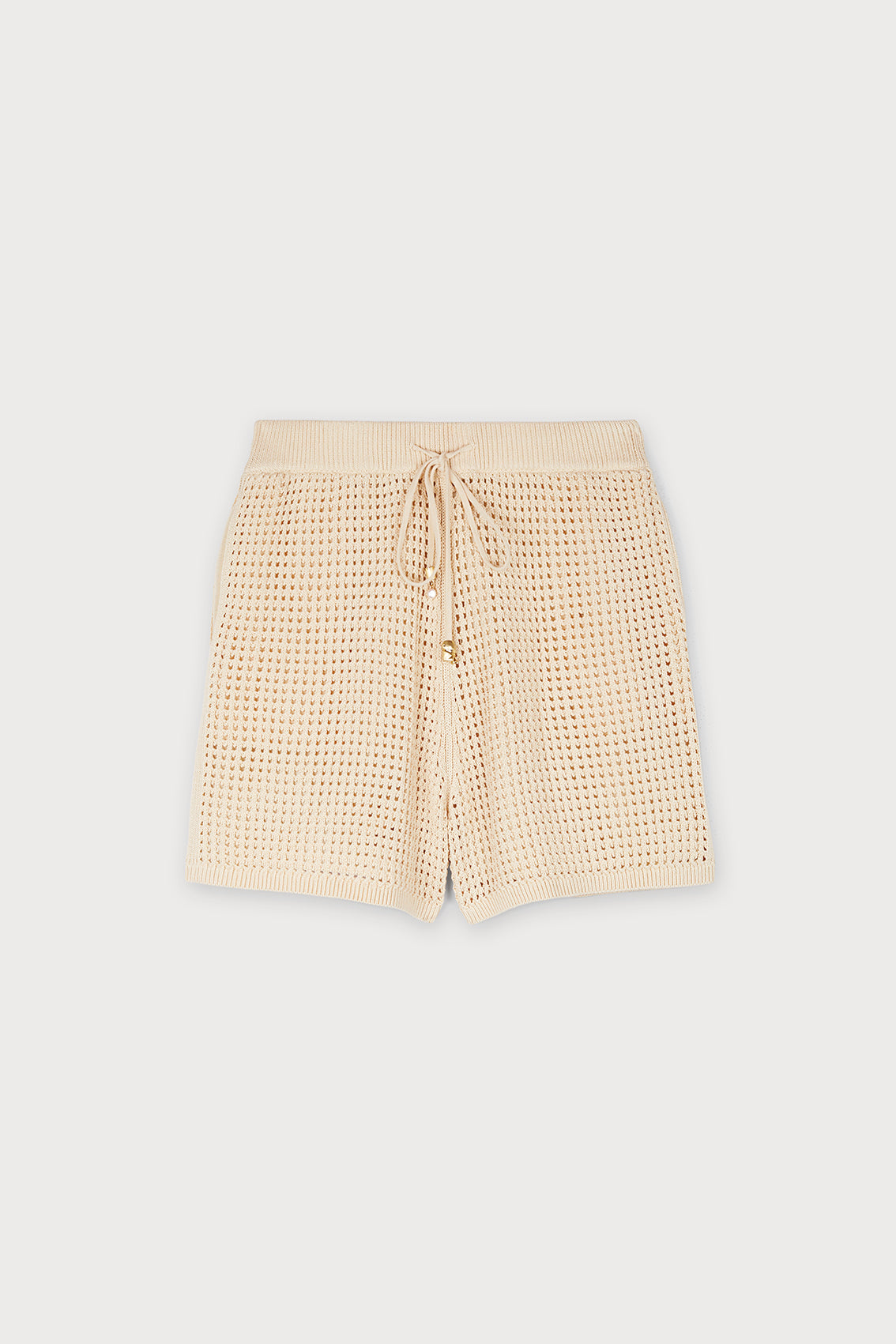 This open-knit shorts featuring a comfortable ribbed waistband and adjustable drawstring with metallic accents. Designed with a relaxed silhouette and breathable texture for casual elegance.