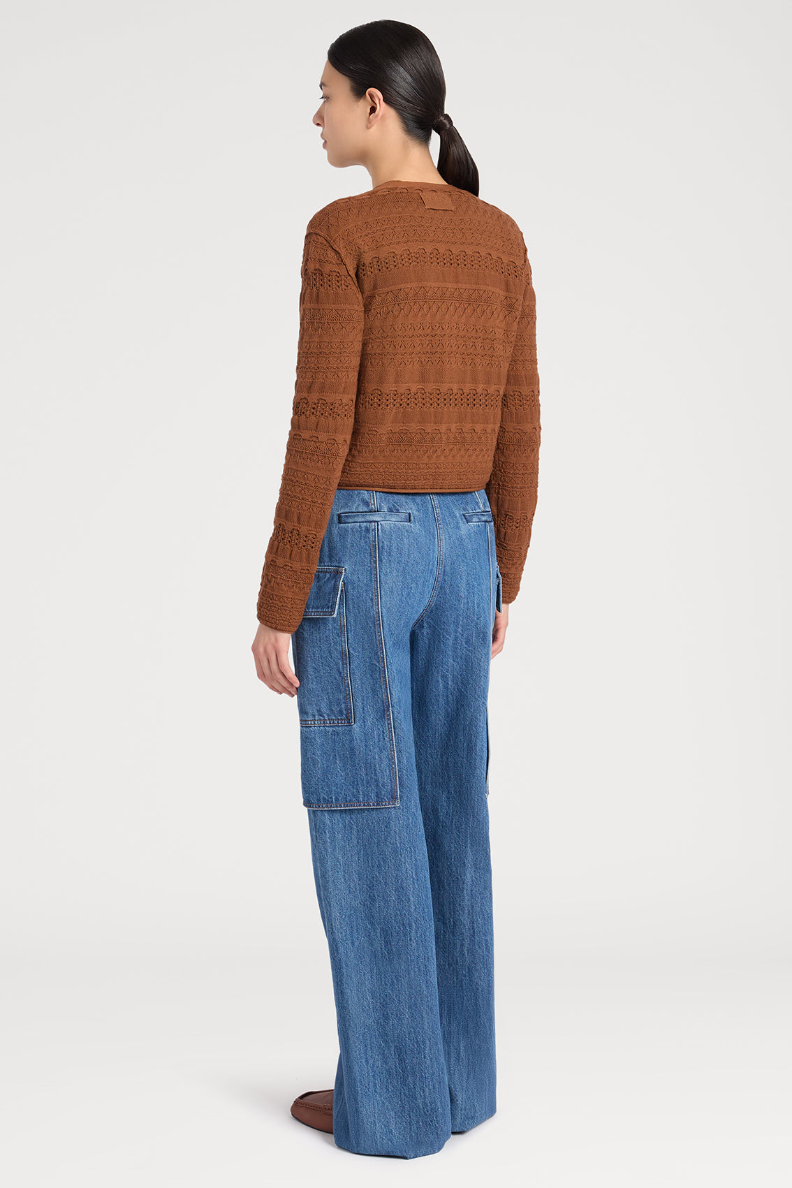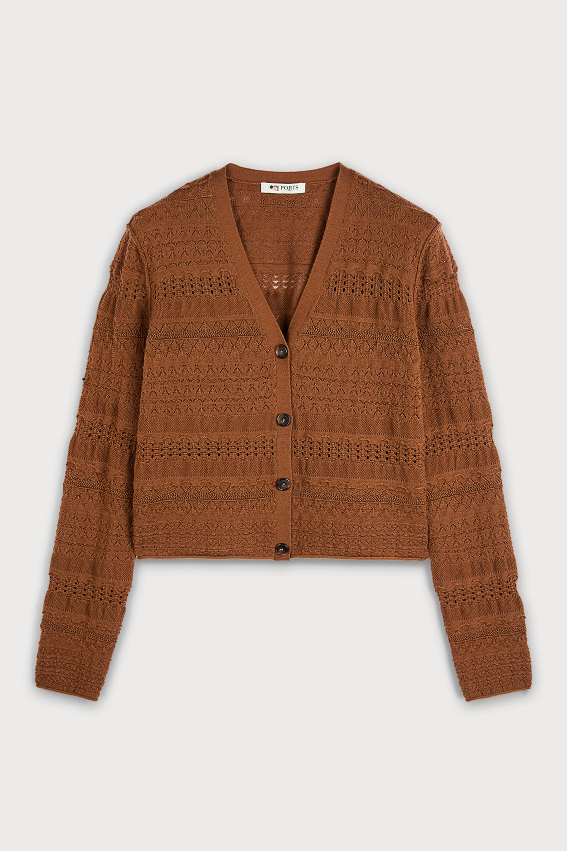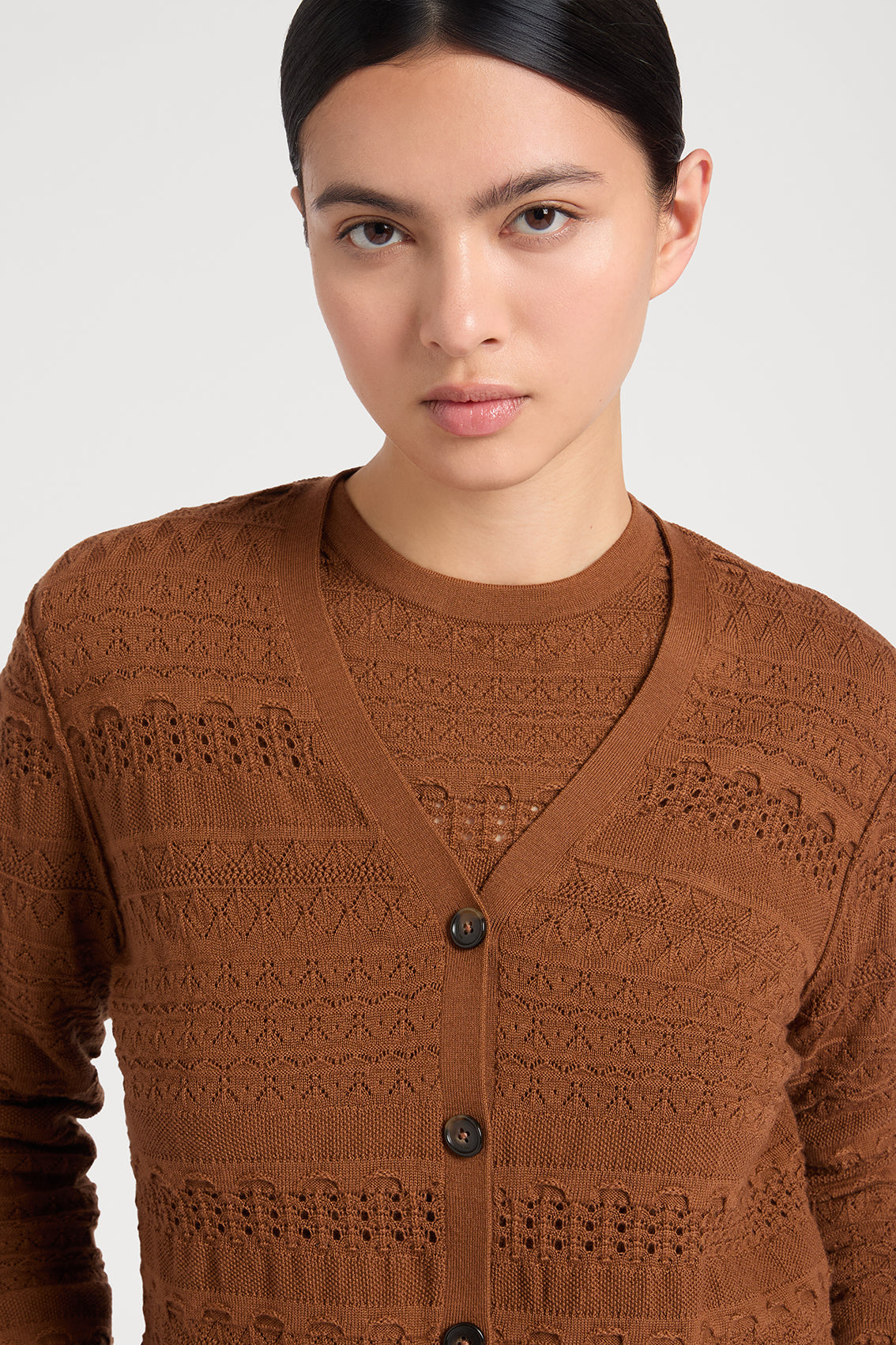 Textured toffee cardigan featuring intricate horizontal pointelle knit patterns. Designed with a classic V-neck, long sleeves, and button closures for a stylish, breathable layer.