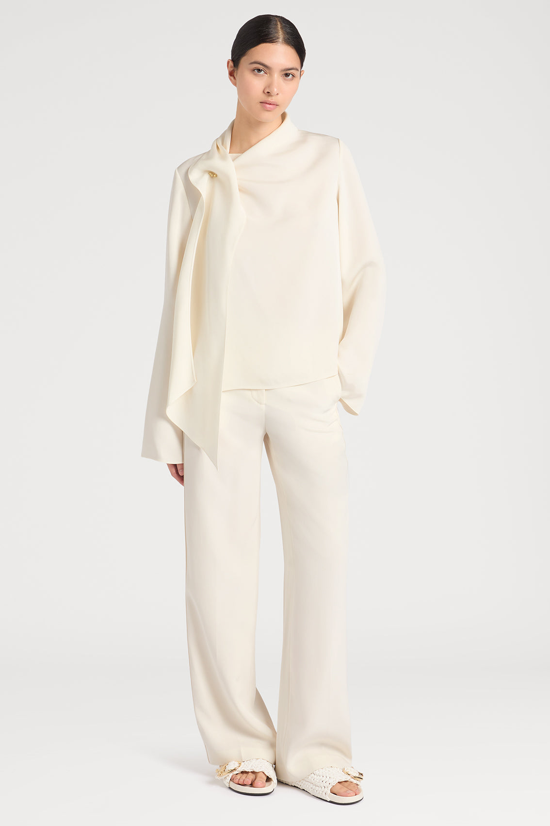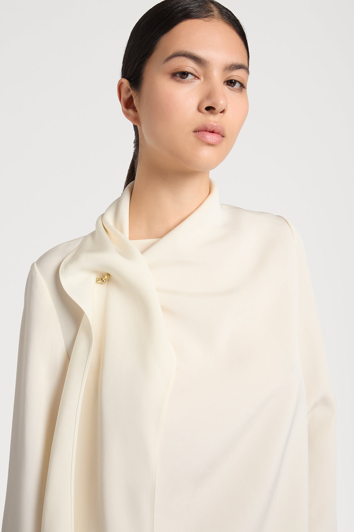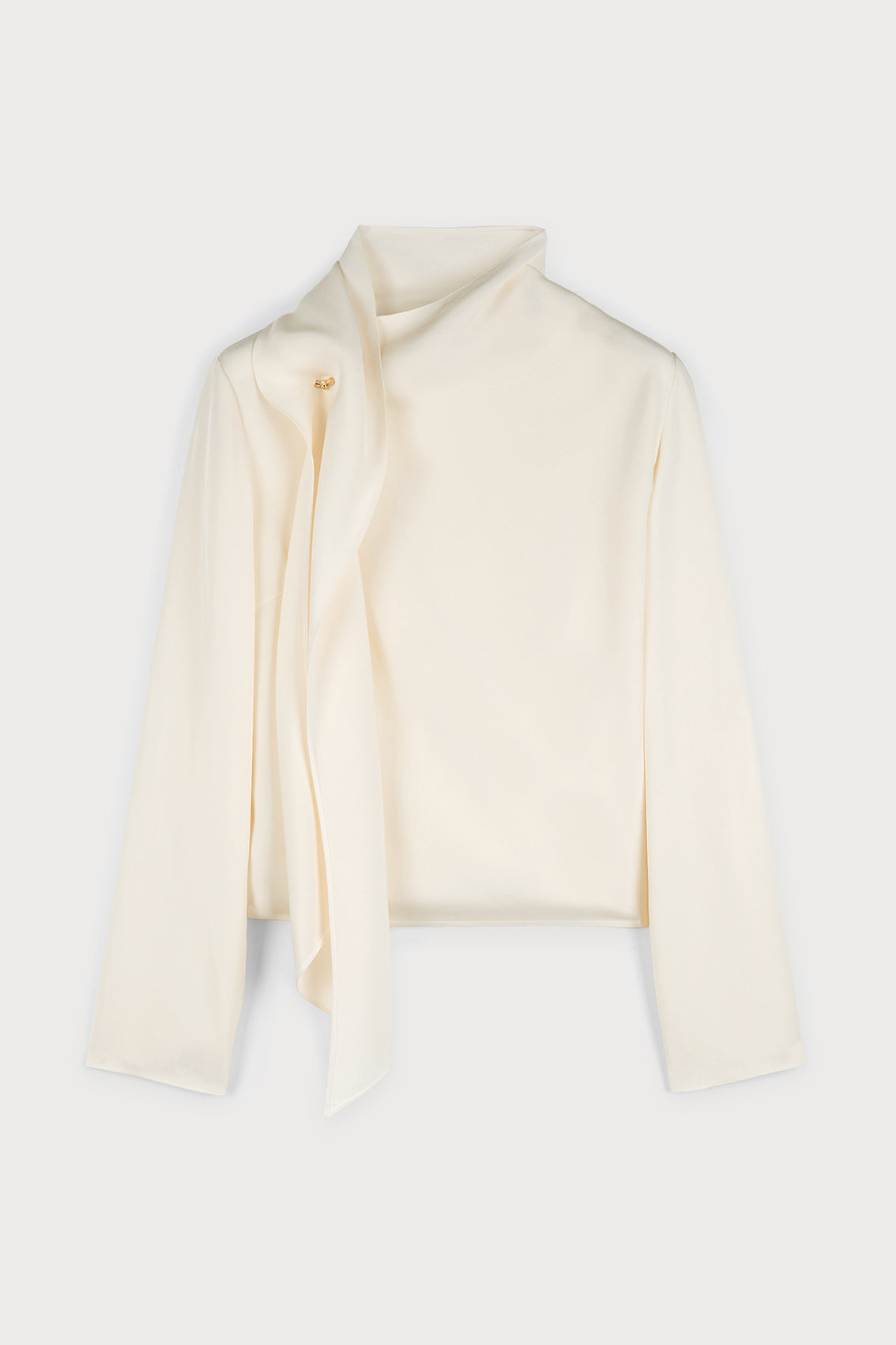 A refined ivory top featuring a draped neckline, long sleeves, and a chic scarf detail, ideal for versatile styling and sophisticated looks.