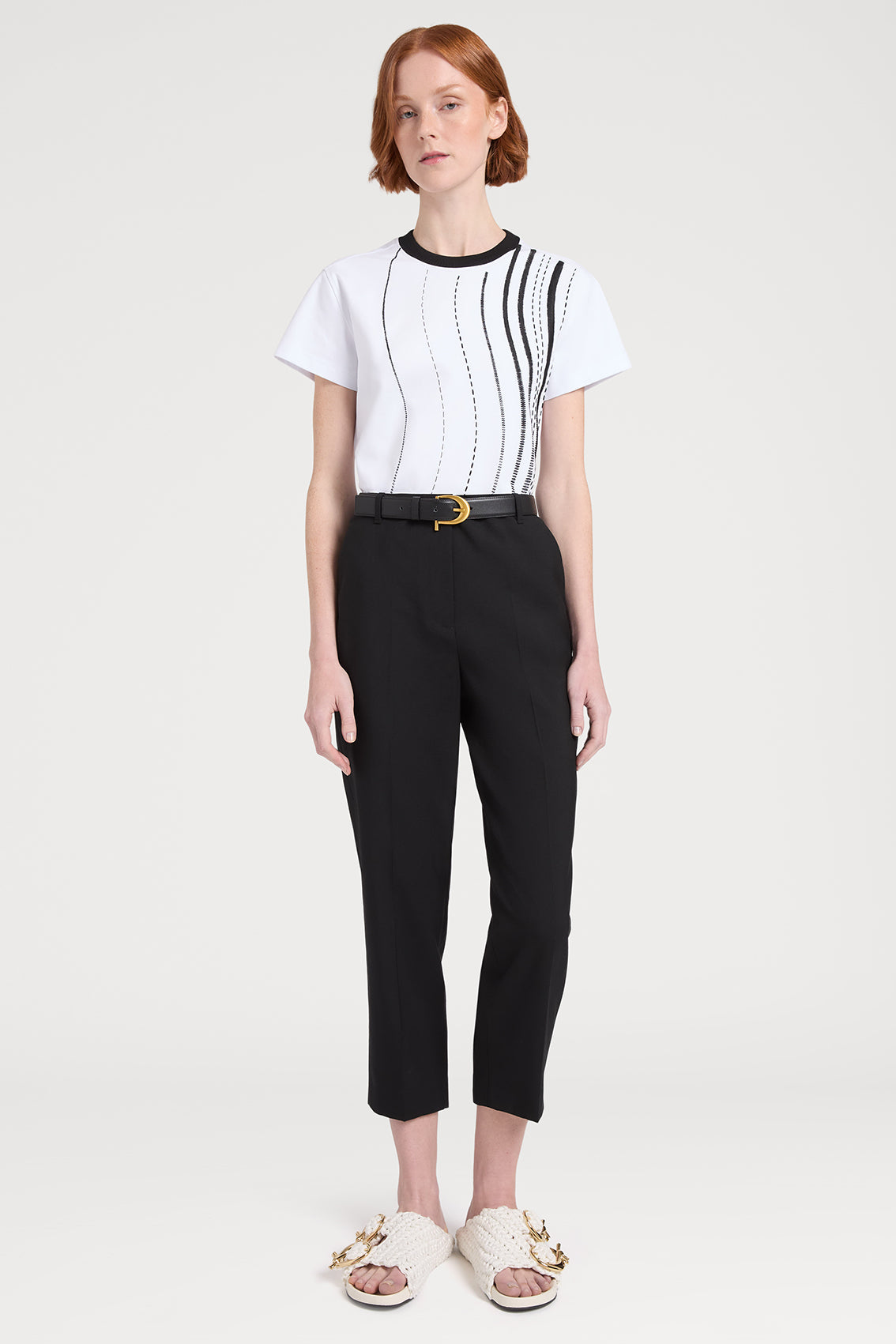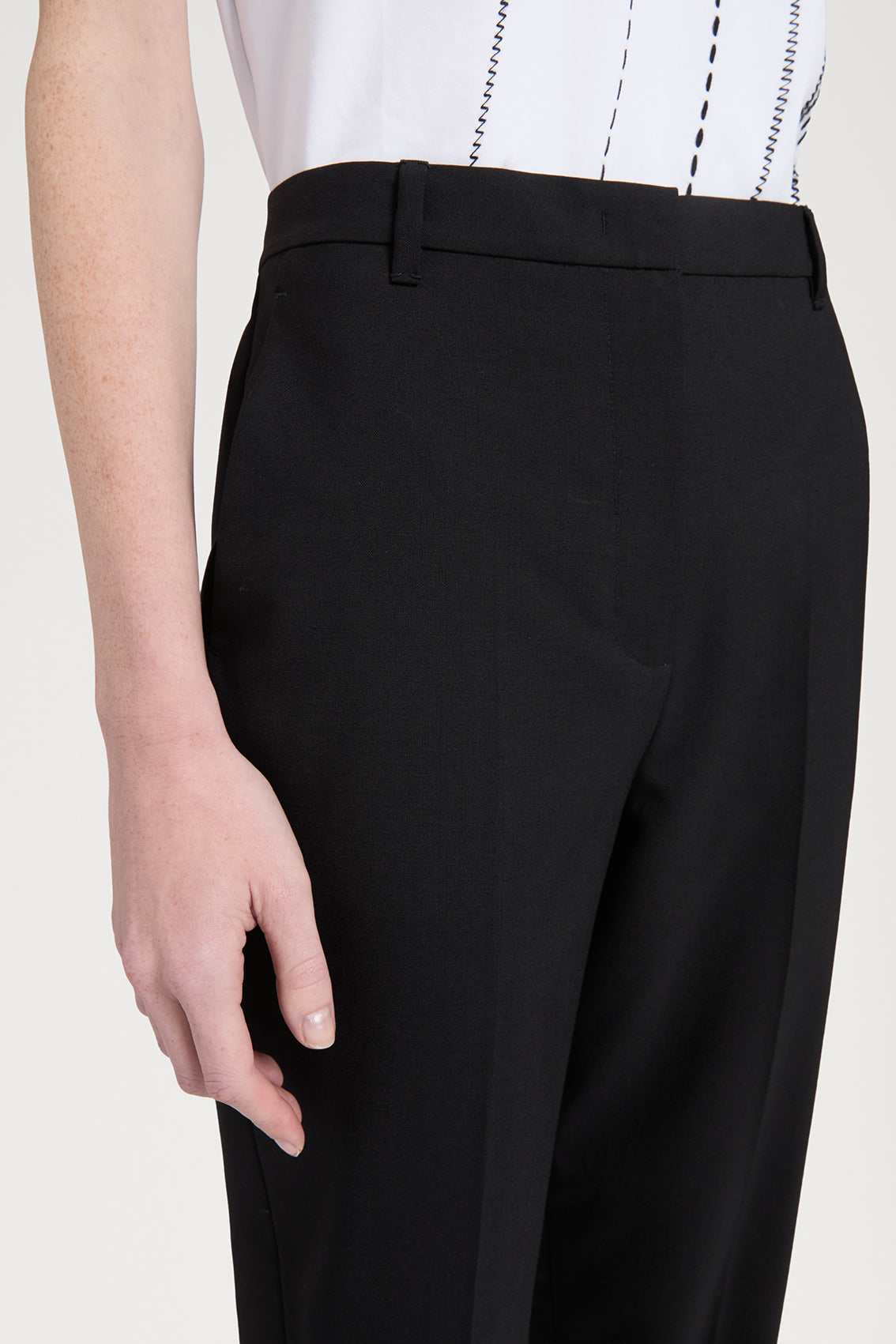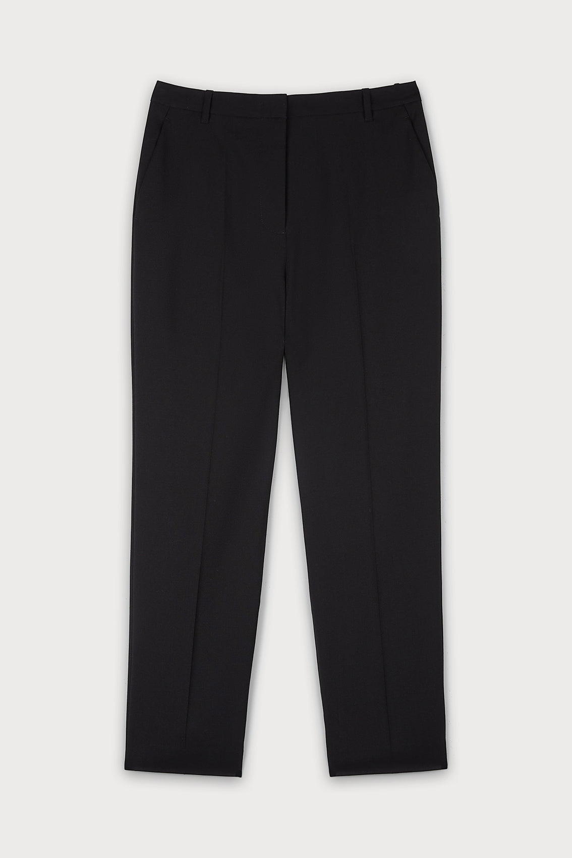 Black tailored trousers with mid-to-high waist, straight-leg cut, front creases, belt loops, side slant pockets, and clean hem, offering a polished, versatile look for office or smart-casual outfits.