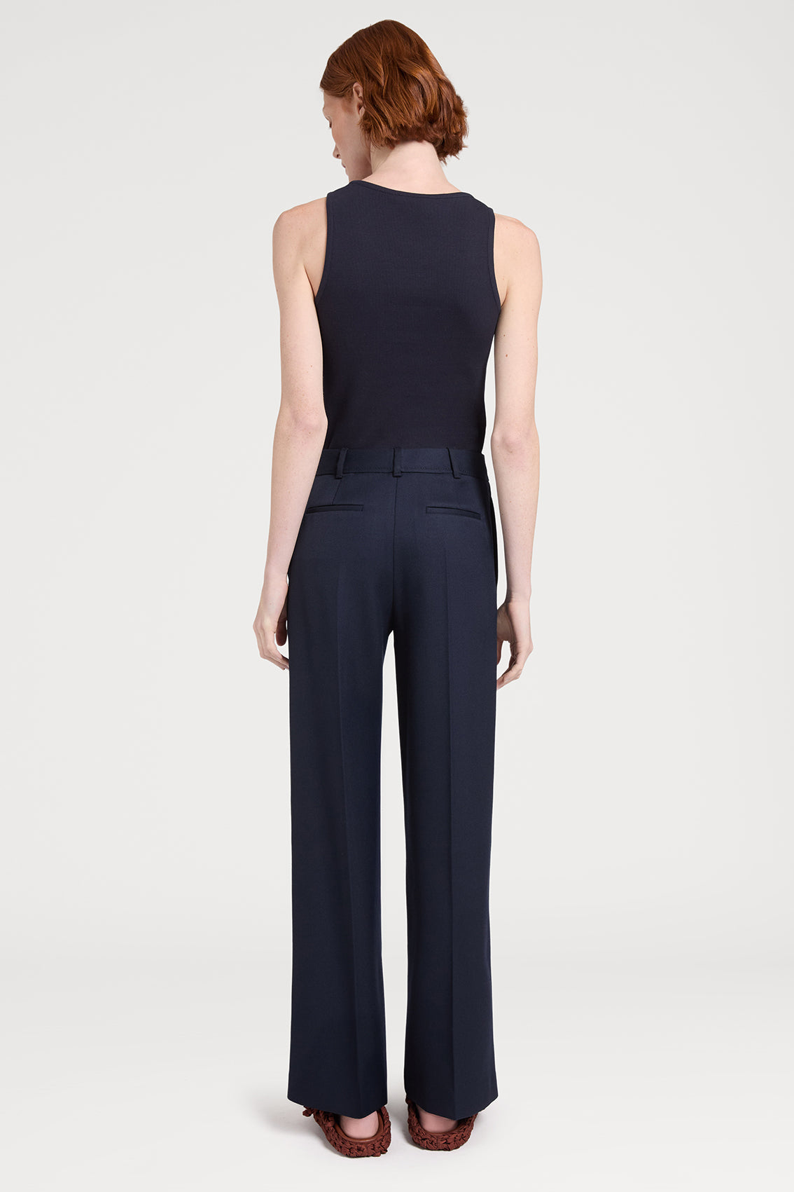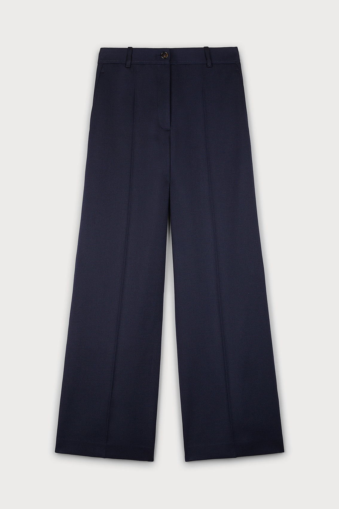Classic dark navy wide-leg trousers with front creases, button closure, and belt loops. Tailored fit for professional or casual styling.