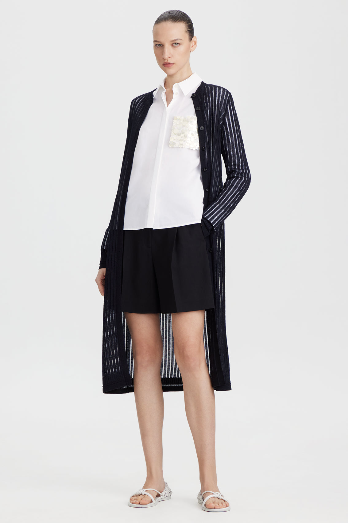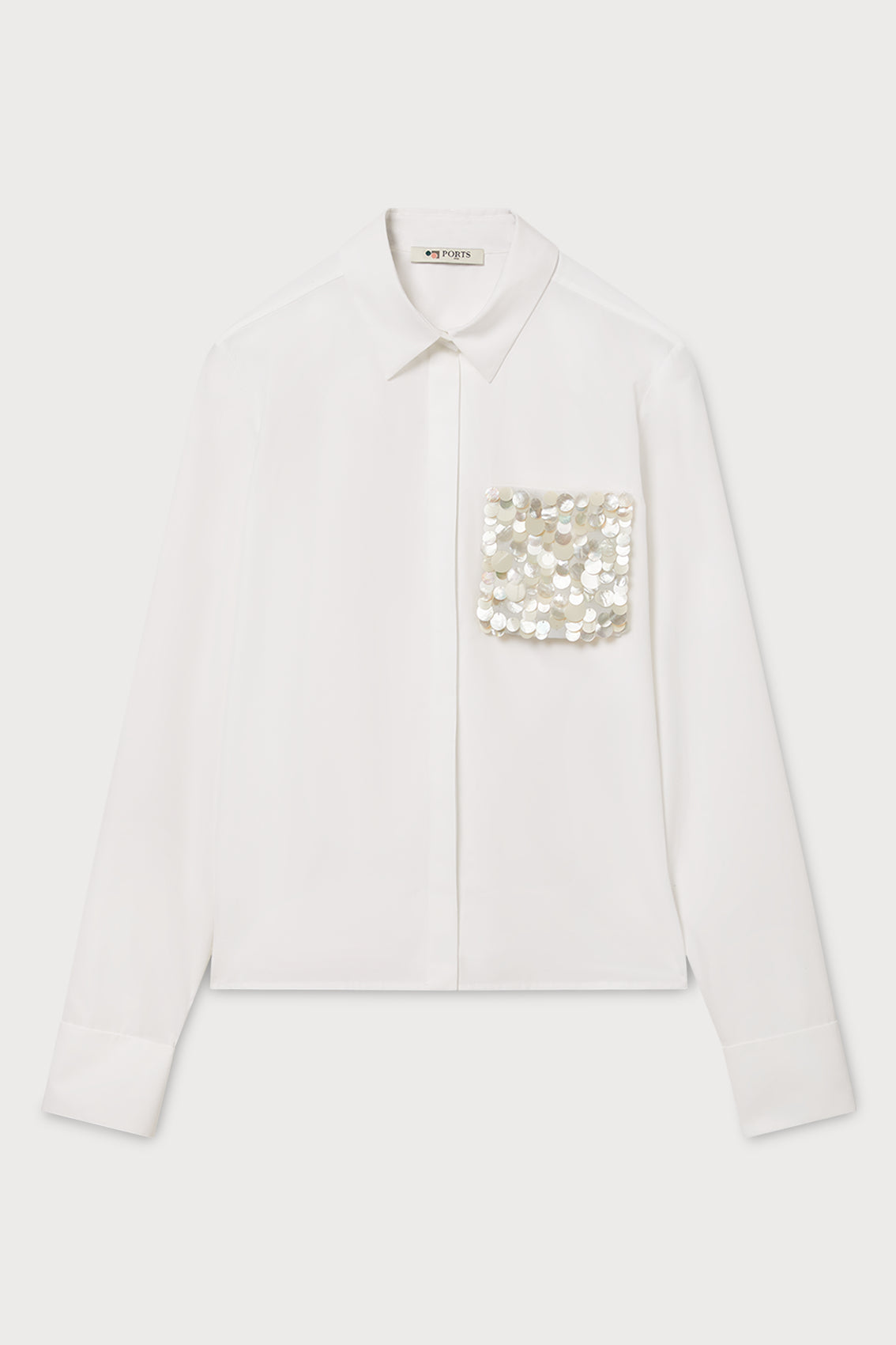 A crisp collared shirt with a striking square sequin-embellished chest pocket, offering a modern, glamorous touch.