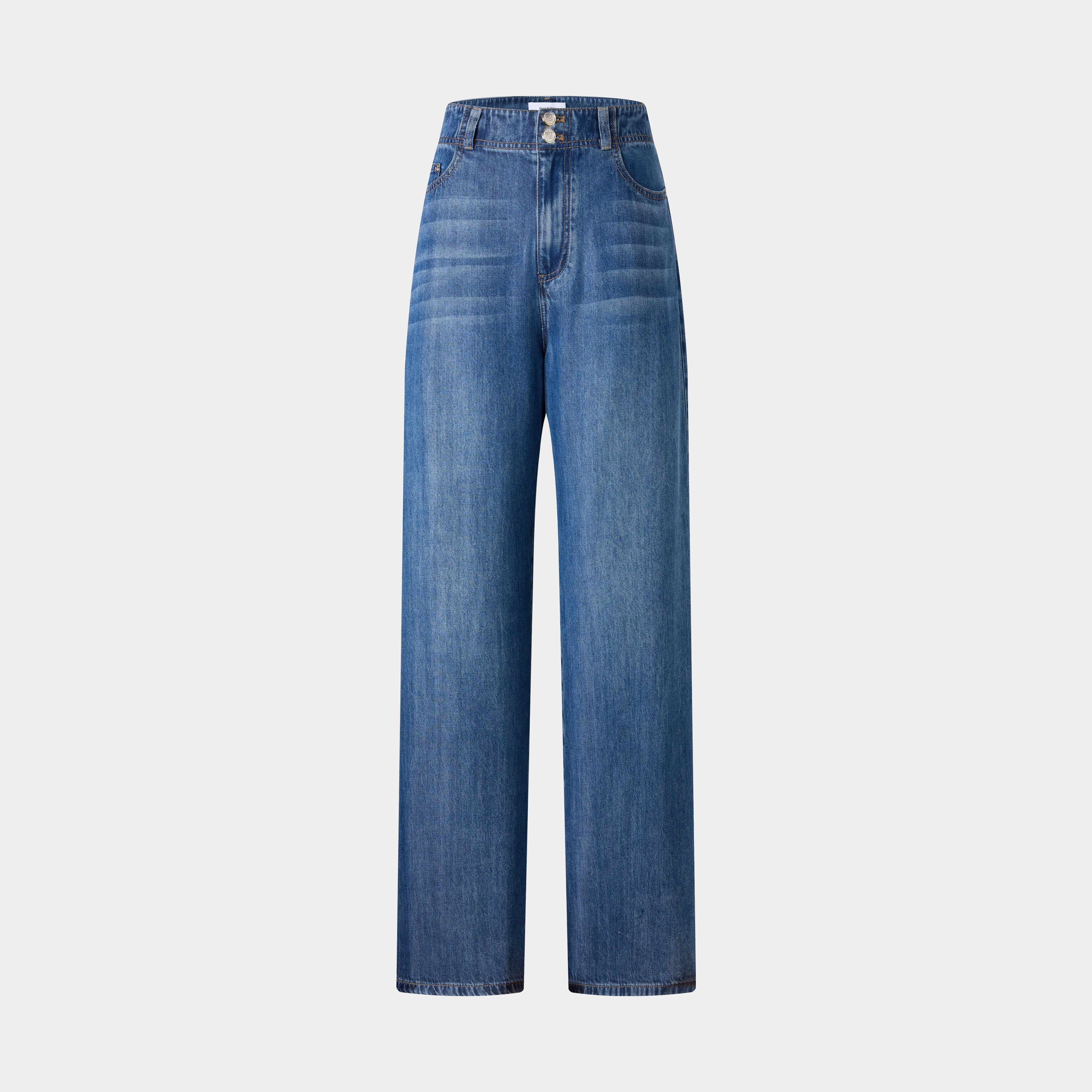High-waisted, wide-leg jeans with a dual-button closure. The relaxed fit and faded wash offer a comfortable yet stylish casual look.