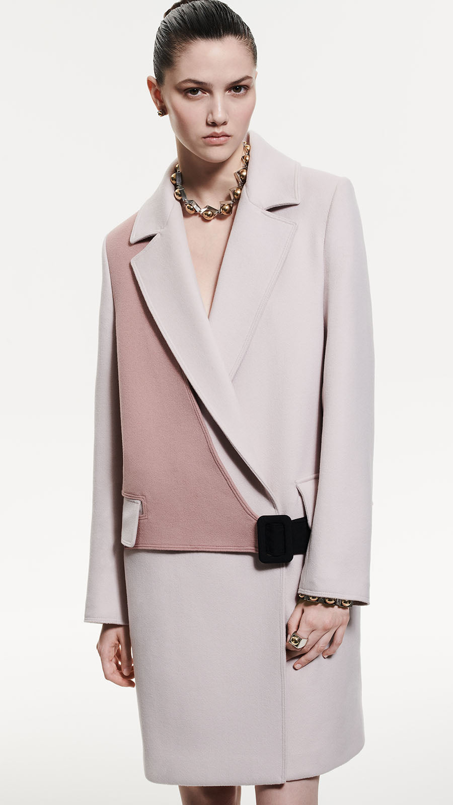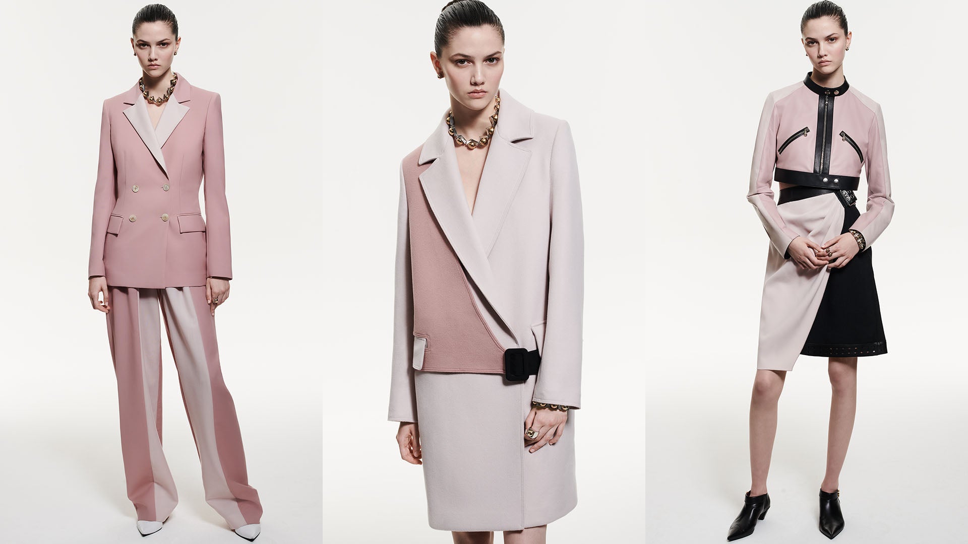 The juxtaposition of toughness and softness defines the silhouettes for this season, merging strict and flowing elements in contrasting fabrics. The collection blends eyeleting and lace with ribbed knitwear, as seen in a classic trench, adding a delicate touch. Tailored coats are adorned with decorative buttons, while soft knits contrast with leather elements, and cable knits are paired with asymmetrical draped skirts featuring grommeting.