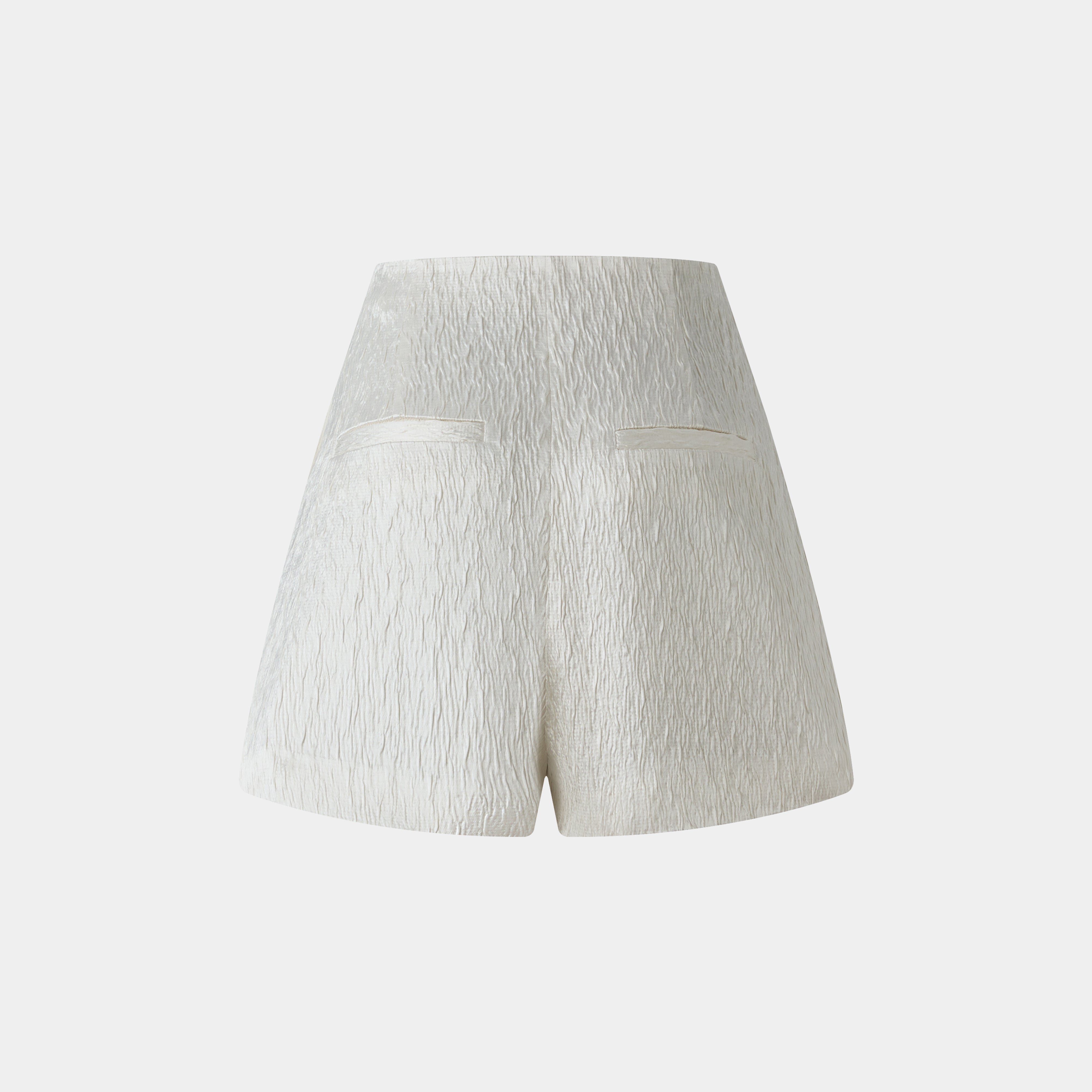High-waisted A-line shorts crafted from textured fabric, offering a unique crinkled finish. Their relaxed fit and clean lines provide a chic, modern aesthetic.