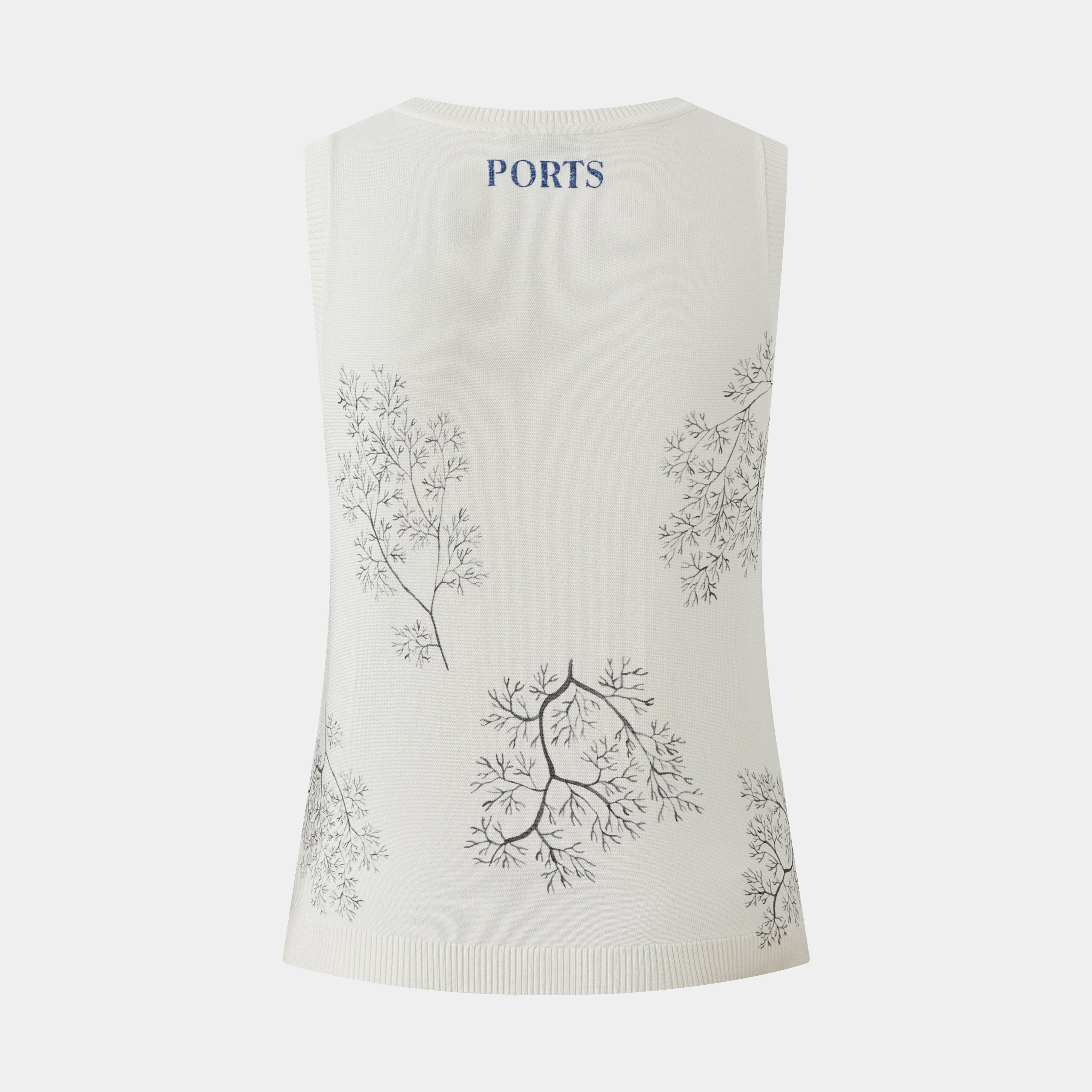 This sleeveless knitted top feature a U-neckline and intricate branch-like patterns. Its ribbed hem provides a structured finish, offering a chic, versatile look.